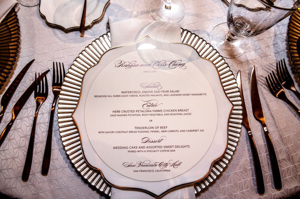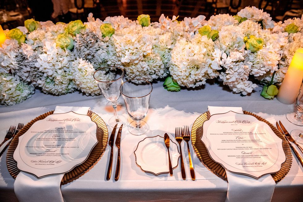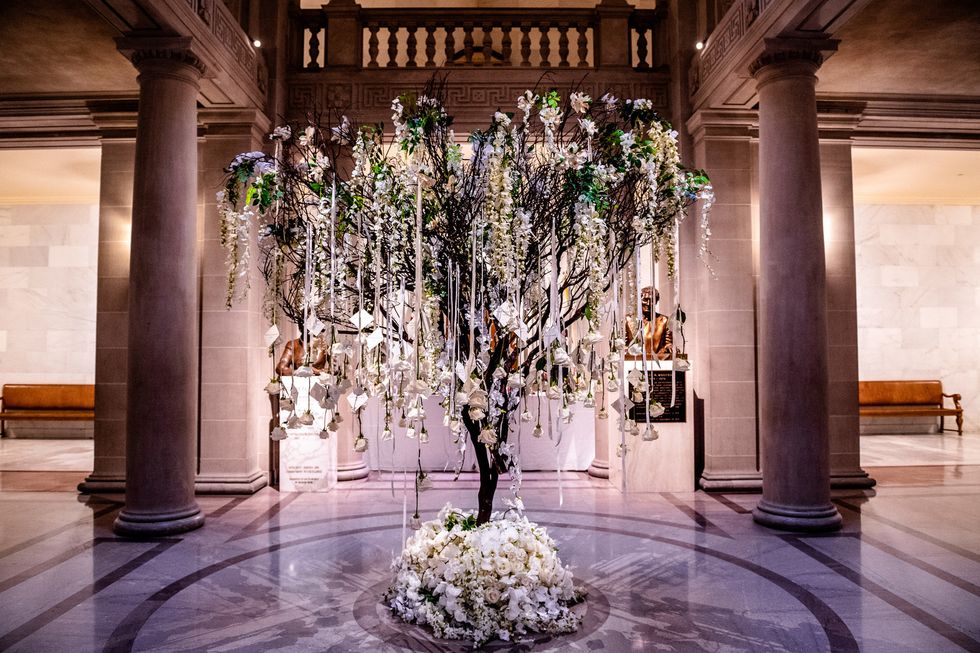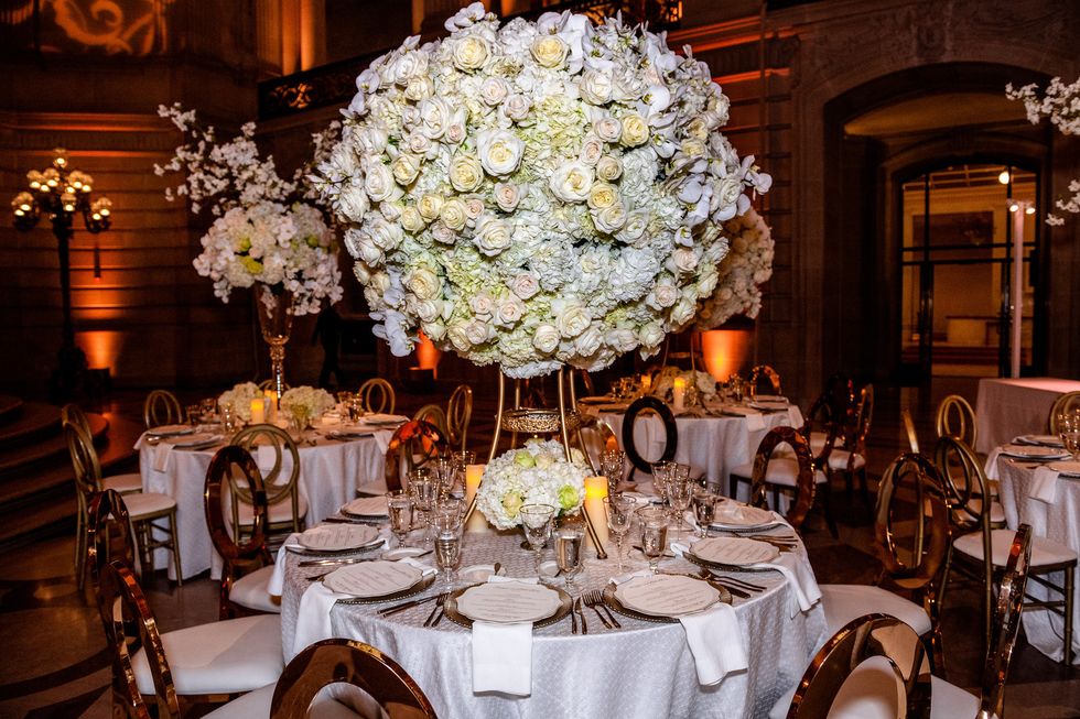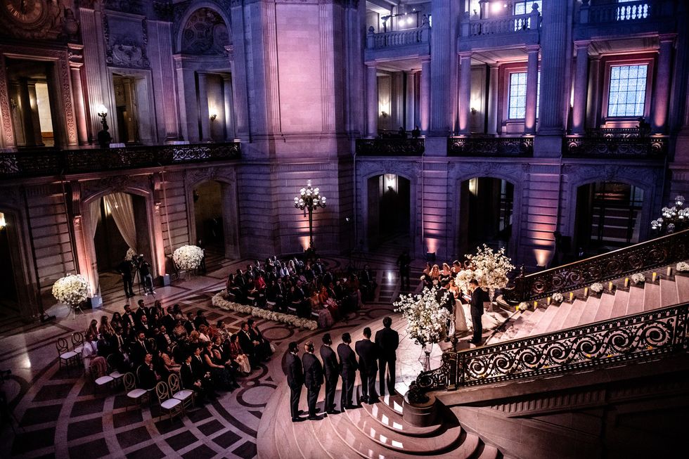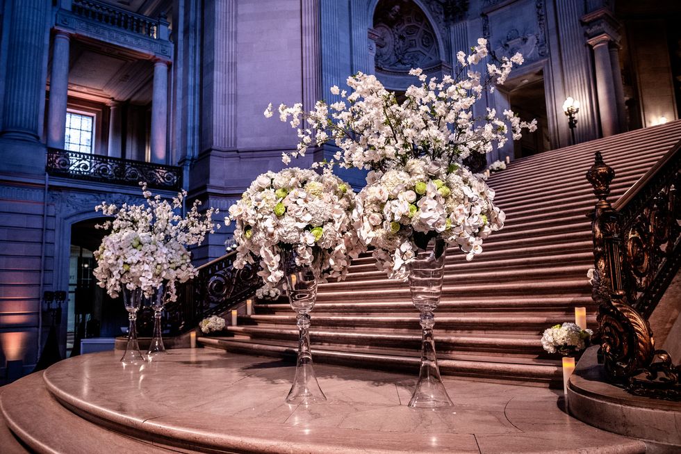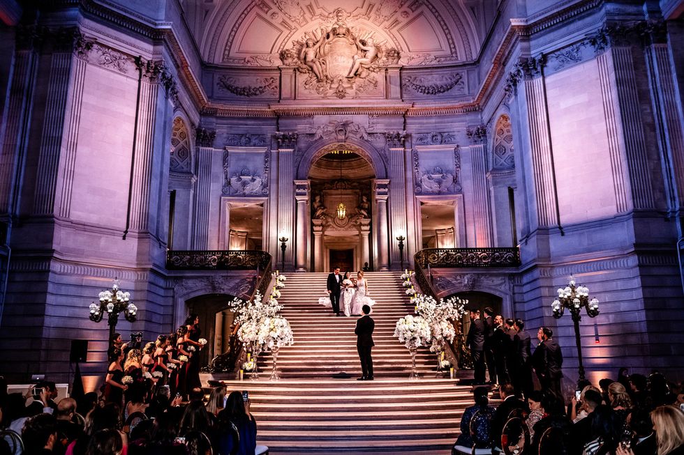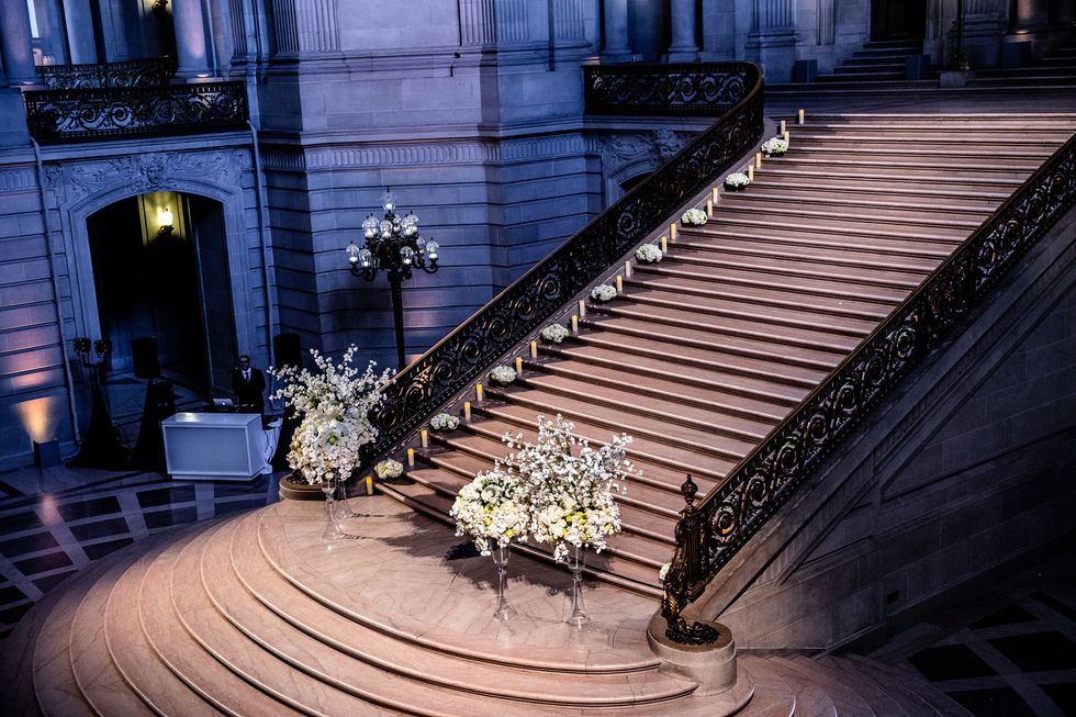 The two threw a gorgeous, raging bash as ornate as the architecture of their venue—SF City Hall. Under the cupola, surrounded by opulent, towering florals with blush toned roses, milky orchids and ivory cherry blossoms spilling over glass floor vases, Cheng serenaded his bride by belting "Perfect" by Ed Sheeran. She in turn surprised him—and the guests—with a performance alongside two Brazilian Samba dancers, adorned in a Met Gala-worthy headdress. It was then that the party really got started and everyone took to the dance floor for the night, while taking breaks to nibble on gold painted macarons.
