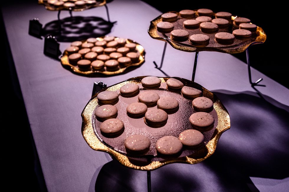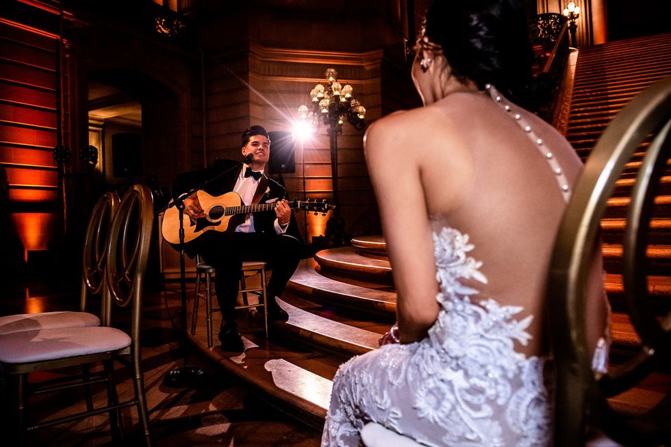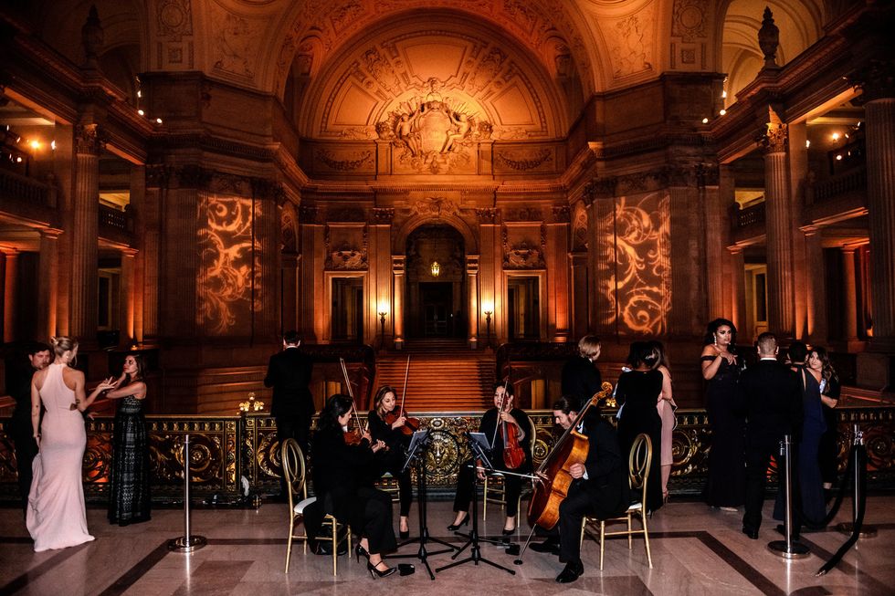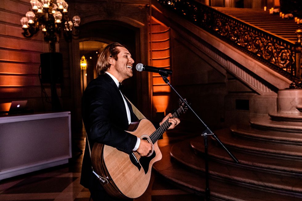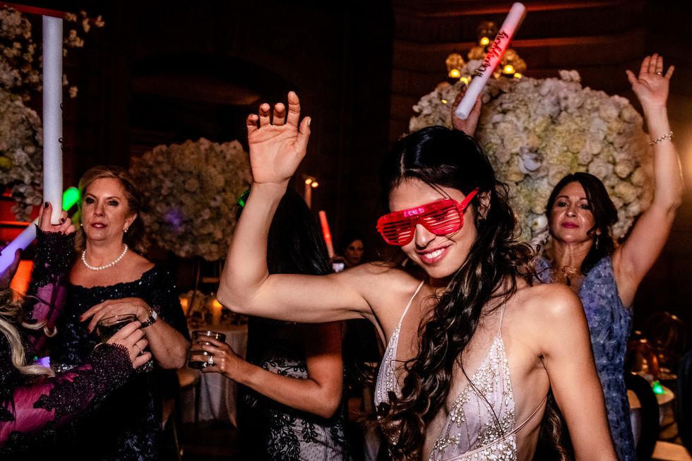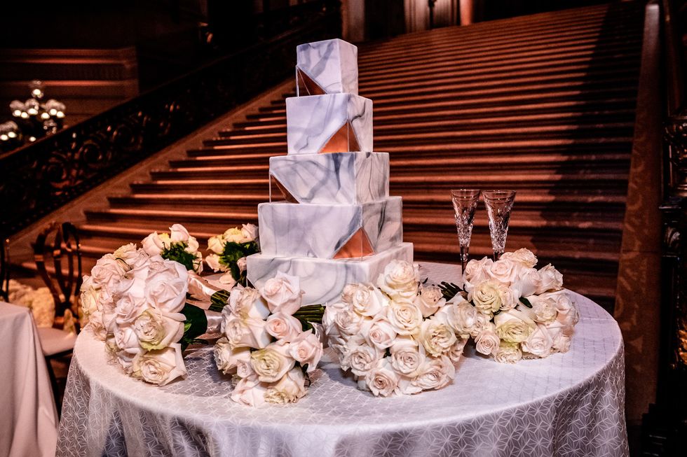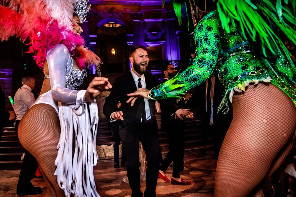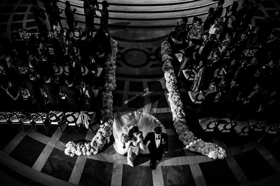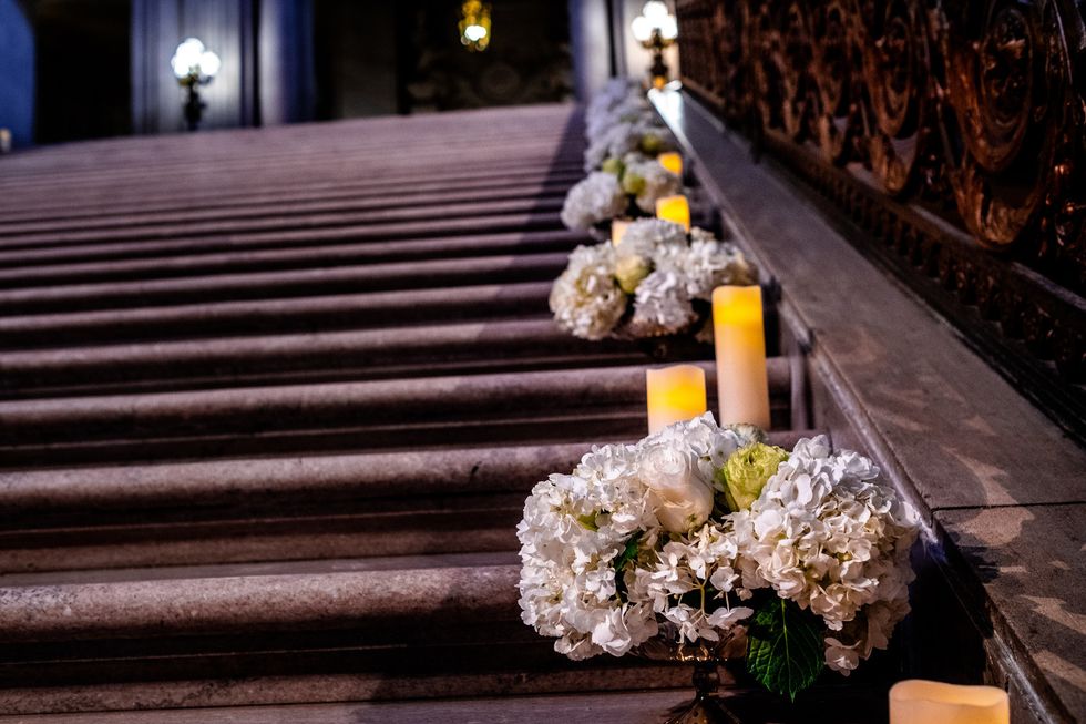 The two threw a gorgeous, raging bash as ornate as the architecture of their venue—SF City Hall. Under the cupola, surrounded by opulent, towering florals with blush toned roses, milky orchids and ivory cherry blossoms spilling over glass floor vases, Cheng serenaded his bride by belting "Perfect" by Ed Sheeran. She in turn surprised him—and the guests—with a performance alongside two Brazilian Samba dancers, adorned in a Met Gala-worthy headdress. It was then that the party really got started and everyone took to the dance floor for the night, while taking breaks to nibble on gold painted macarons.