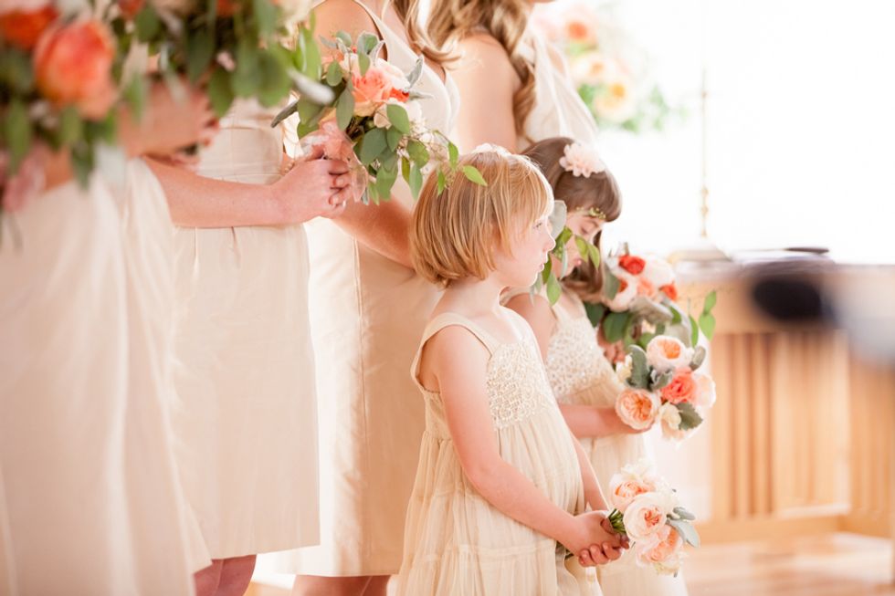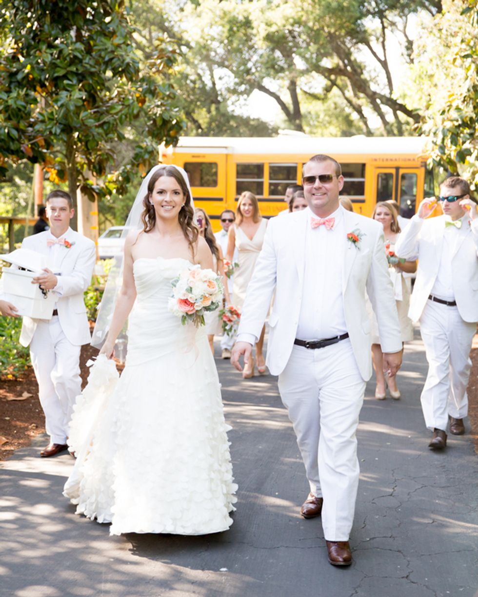 After a bright service at their local church, the newlyweds and guests took yellow school buses back to their grandmother's home, where an intricate backyard reception awaited, decorated with string lights, beautiful neutral colors, and whimsical flowers.