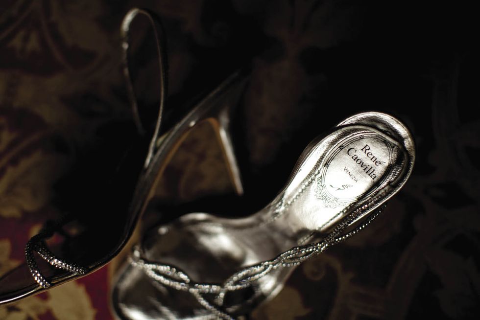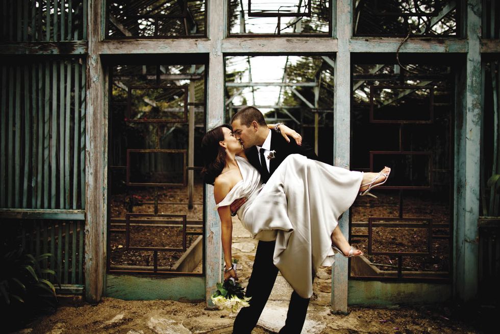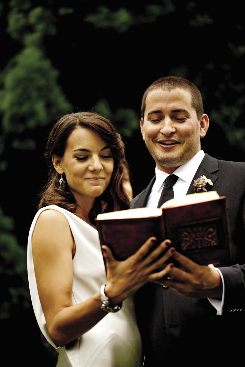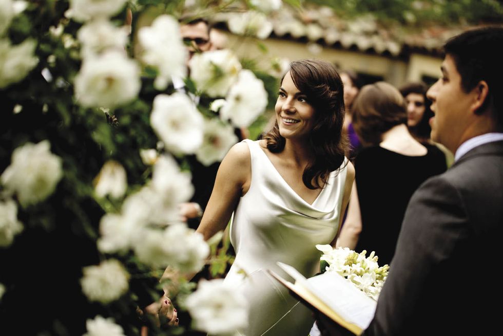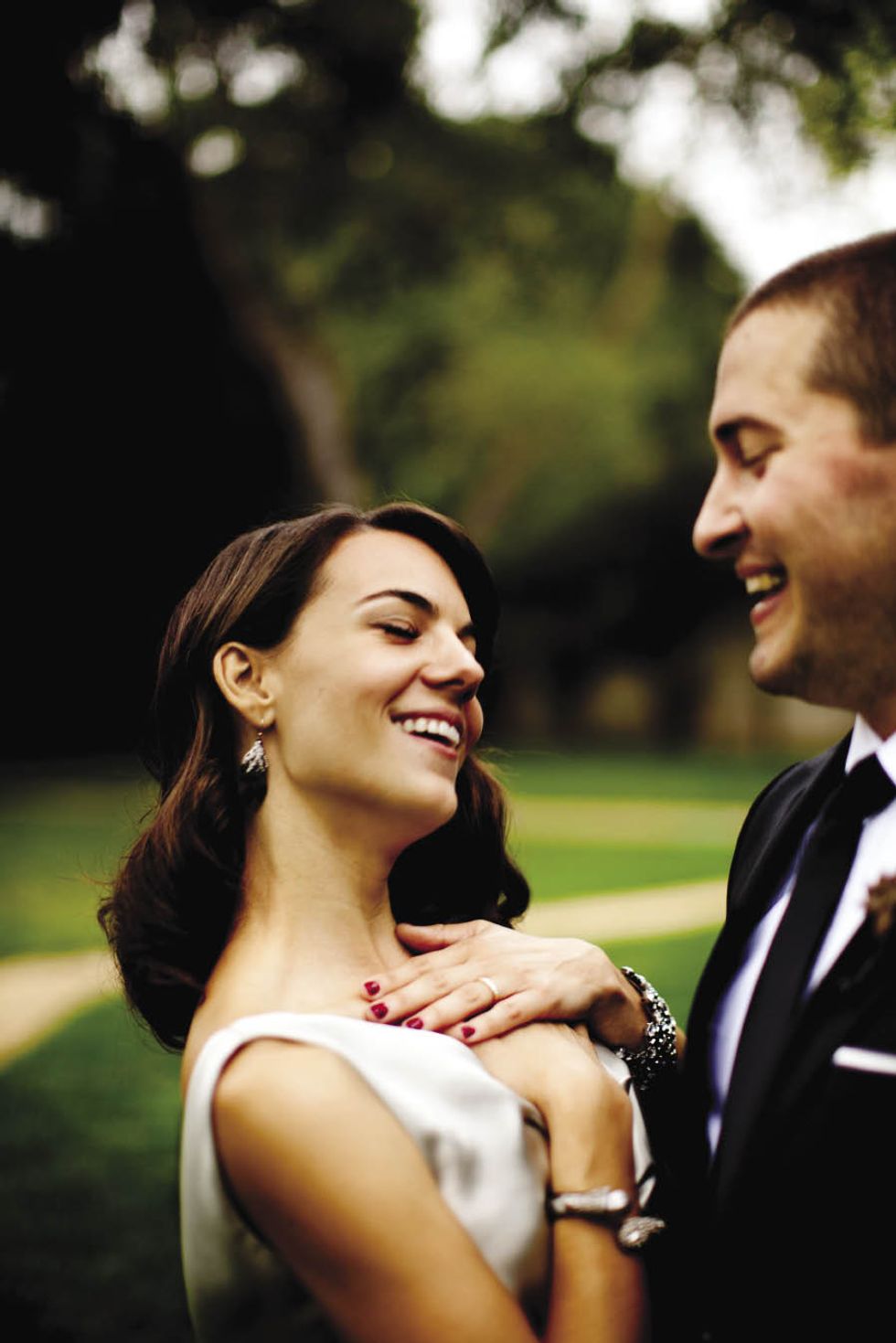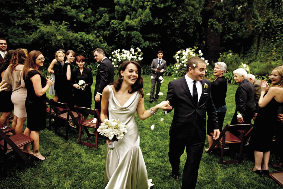 The event had an elegant, vintage vibe, from the 1930s–style finger wave in Natalie's hair to Ravenscroft, the classic Montecito estate where they wed. Her shoes, Rene Caovilla sandals, were scored at a Neiman Marcus Last Call outlet store. "I'm not a solitaire girl," says Natalie, whose gold-and-diamond Tiffany & Co. engagement ring suits her style. "I decided not to get a wedding band because it's beautiful alone," she adds. Matt's ring belonged to his late father. The couple wrote their vows in this leather-bound book. Their officiant, a good friend ordained for the occasion, circulated it among the guests, so they could write considered messages in it. The bride and her father began the walk to the altar in this greenhouse on the grounds. As the bride and groom walked back down the aisle, they realized they had no plan for where to go. Uncertainty morphed into hilarity after guests chased the couple and pelted them with flower petals.