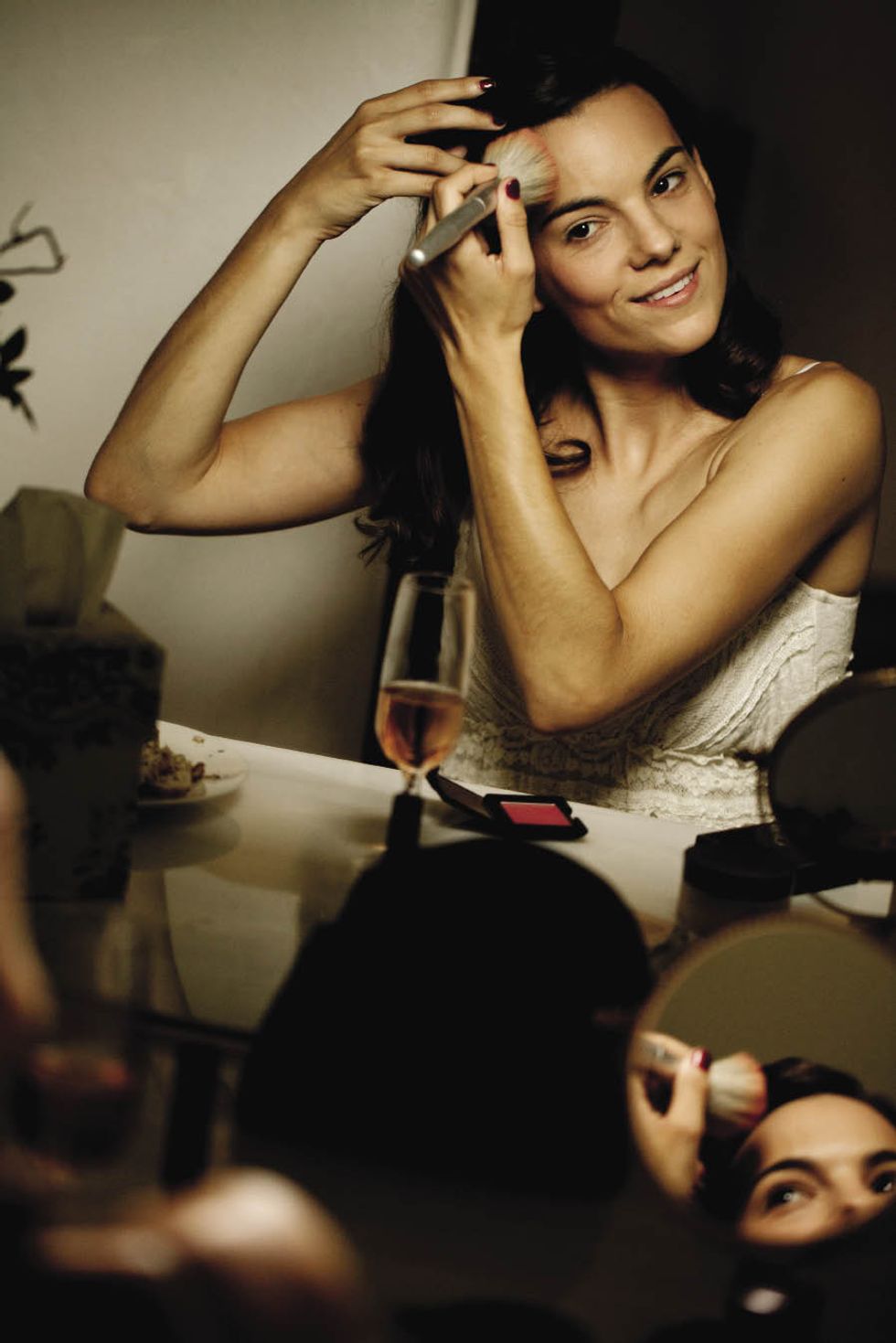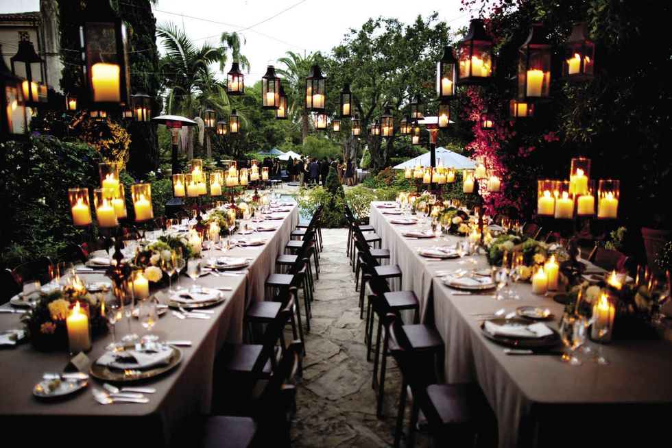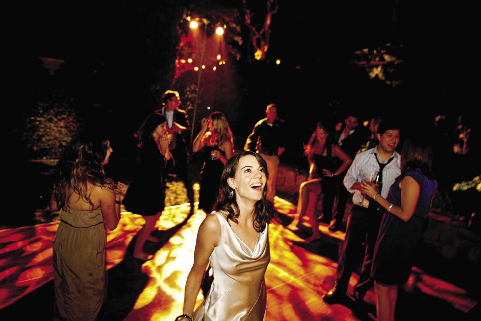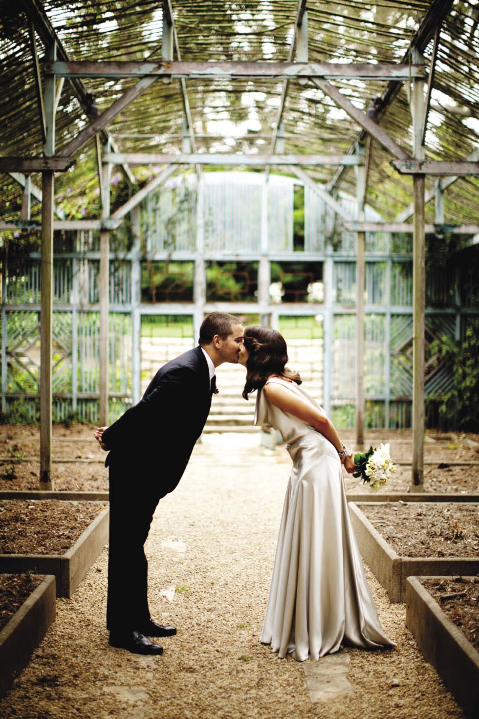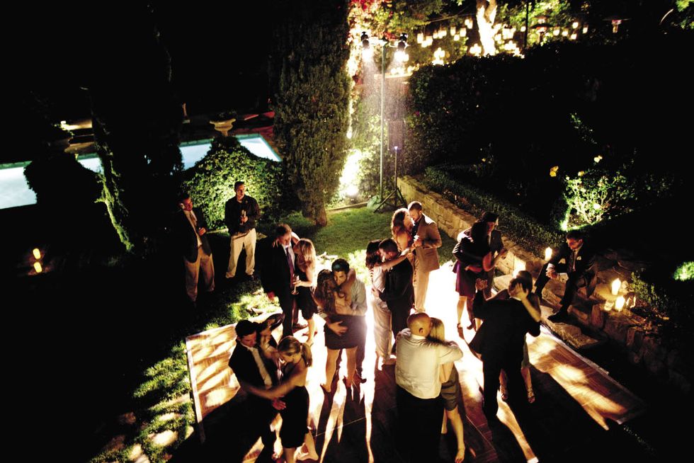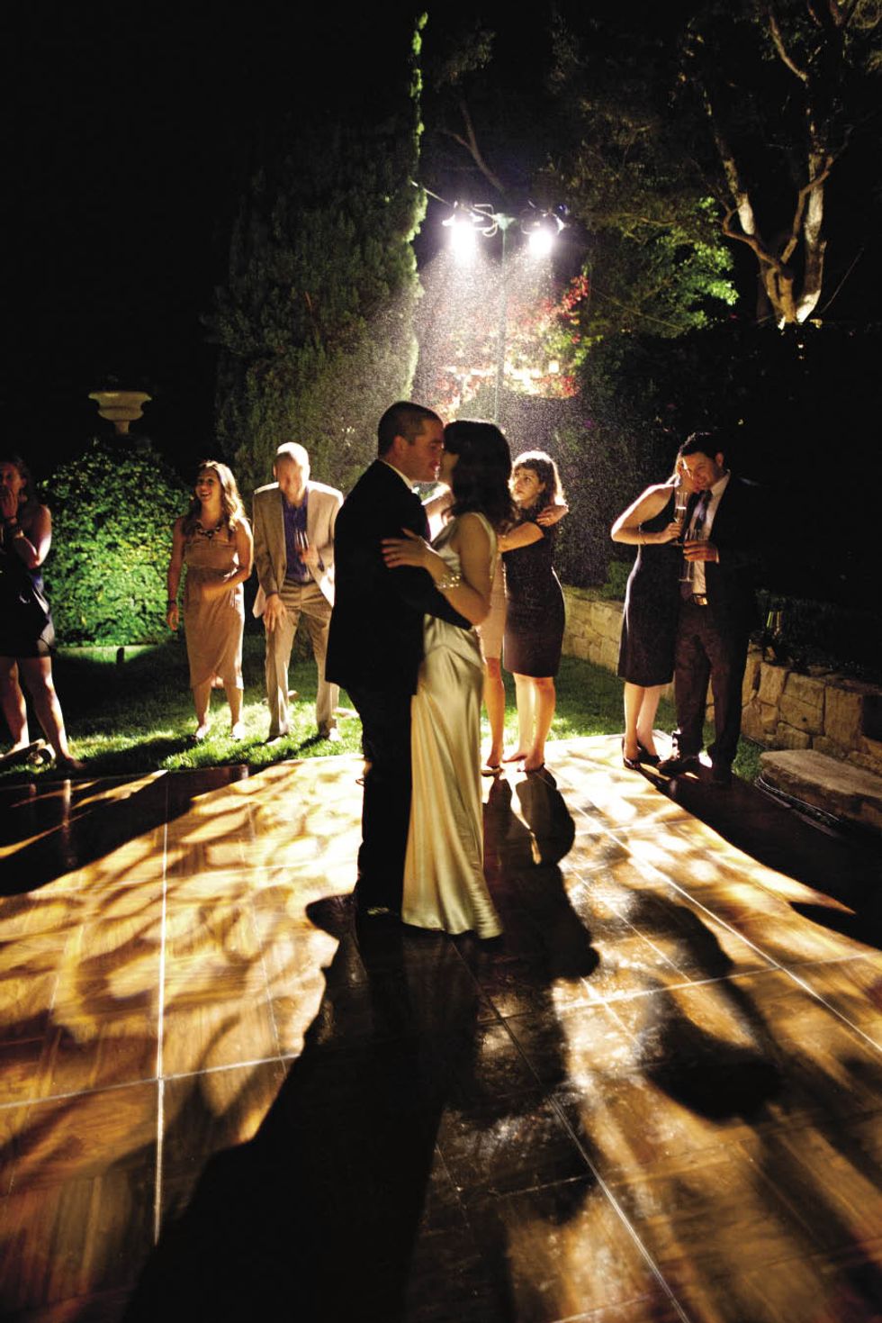 Two long tables set with vintage plates and flatware were stationed on a secluded patio under some trees. The lanterns were suspended on wire that seemed to disappear as it grew dark. "It looked as if the candles were floating above our heads," says Natalie. After dinner, a light rain started to fall, but the couple was far from upset. "The way the mist came down over us on the dance floor and how it glittered against the spotlight was like something from a movie," says Natalie. The bride, hearing a voice from above, looked up to see her groom calling her to the balcony for her bouquet toss. The party was supposed to be over by 11 p.m., but guests danced until 1 a.m. and then feasted on pizza in the greenhouse. After the last guest departed, the couple recreated their first dance.