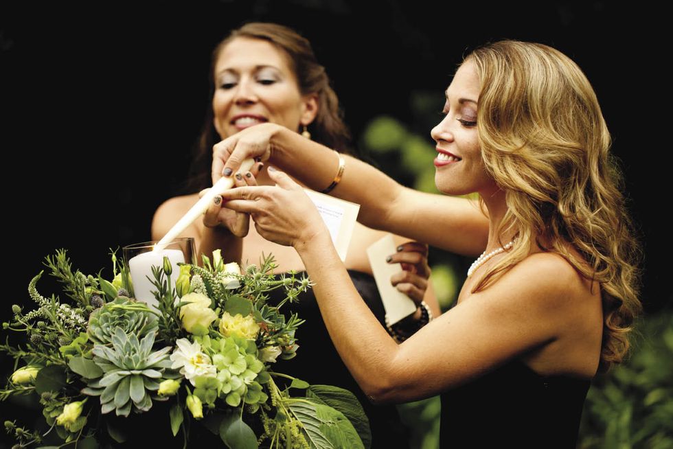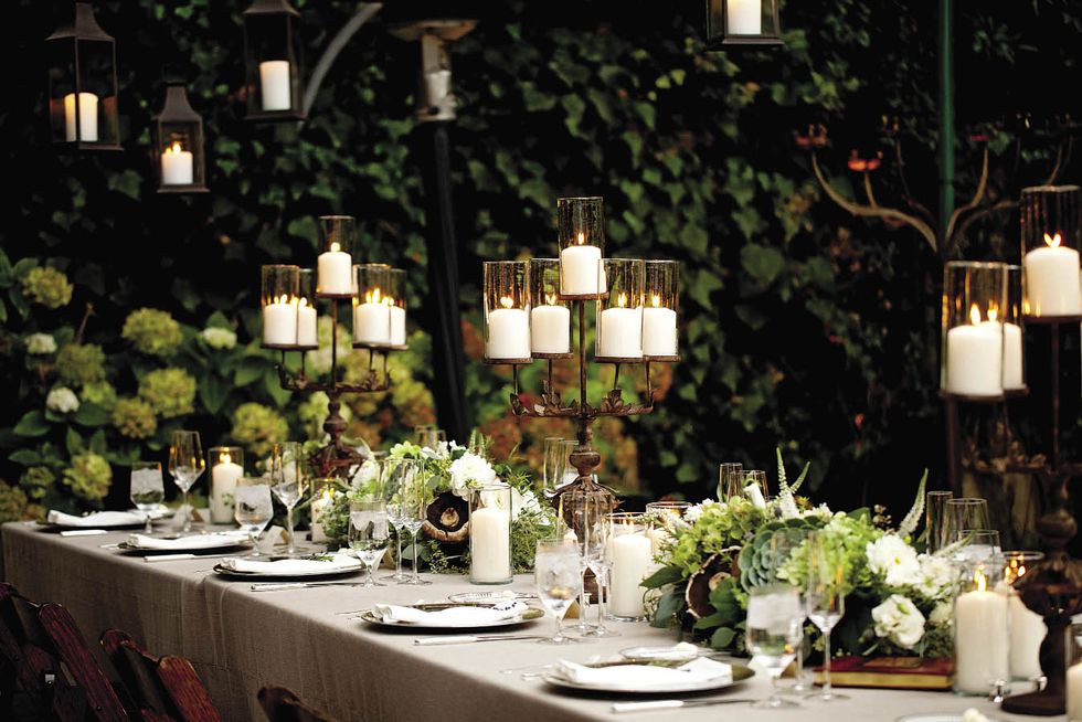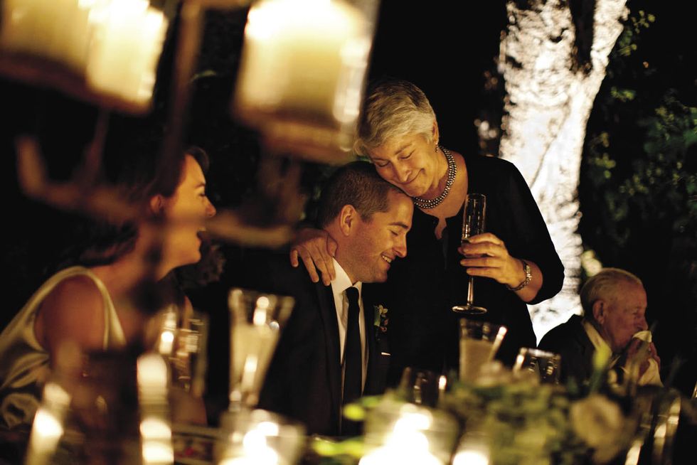 Matt's sisters, Stephanie Wages and Melissa Wages, lit a candle in remembrance of their father at the beginning of the ceremony and read passages from his favorite song, "Amazing Grace." "We wanted the event to feel like we were throwing a dinner party at home," says Natalie. "And it really did feel that way since our families had been staying on the property all week. There were 30 of us in total, including the officiant and photographer, who are both old friends." Tradition has it that the couple shouldn't kiss before being pronounced husband and wife. But Natalie and Matt almost broke the rule during the ceremony. "It's just natural for us to go in for a kiss," she says. "We almost did several times, but the guests cried 'no, no!'" After the vows, surrounded by grandparents, parents, and siblings, no one objected to a little PDA.