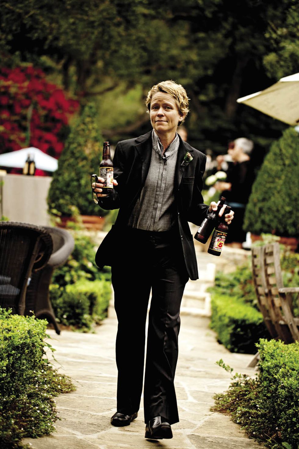 The groom wore a Hugo Boss ensemble, and the bride, after a rough start, wore a Jenny Packham gown. "I was determined to find a dress that didn't look like a wedding dress," she says. The first trip to a bridal salon ended abruptly when she exited in frustration to find some Champagne. A few weeks later, the answer was found in this platinum gown. Frankie Frankeny, the bride's sister-in-law, got the celebration started with Racer 5, the couple's favorite beer. The bride wanted the dinner to be lit entirely by candlelight, so 100 candles were ordered for candelabras and lanterns. During dinner, Georgia Wages, the groom's mother, was one of many guests who stood to give a toast. "Impromptu speeches spanned the entire course of the meal," says the bride.