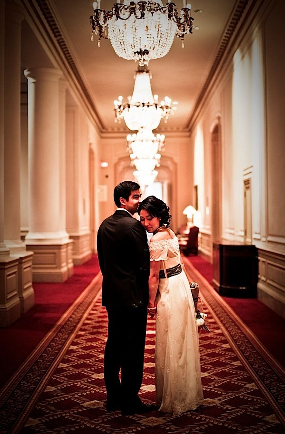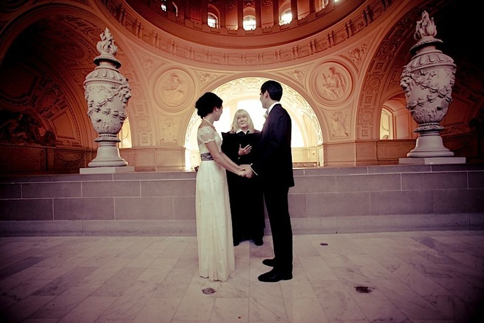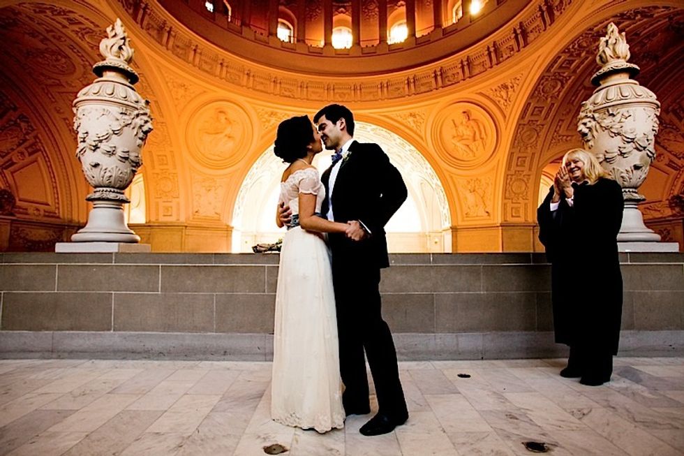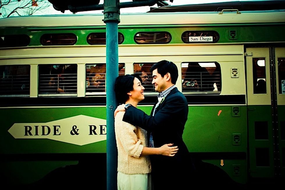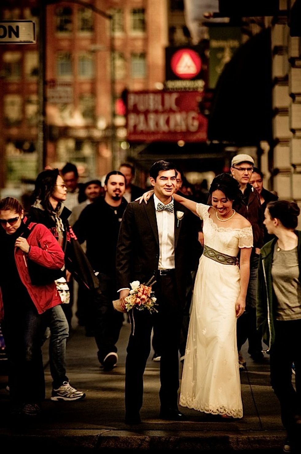The bride looked wonderful in an embroidered gown with a lace, sweetheart neckline, and a unique turquoise sash around her waist. Before the ceremony at City Hall, the couple took to the streets of SF - snapping shots in front of MUNI cars and on street corners. The party was held at Boulevard where the party lasted late into the night.