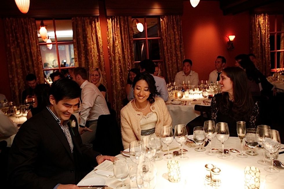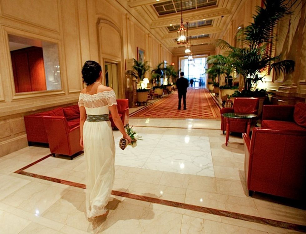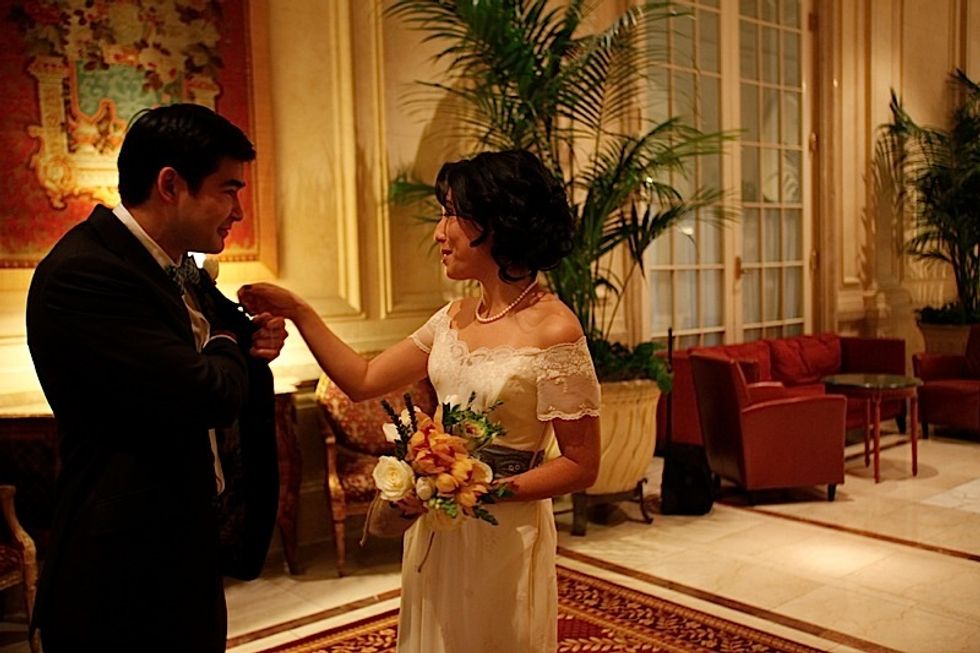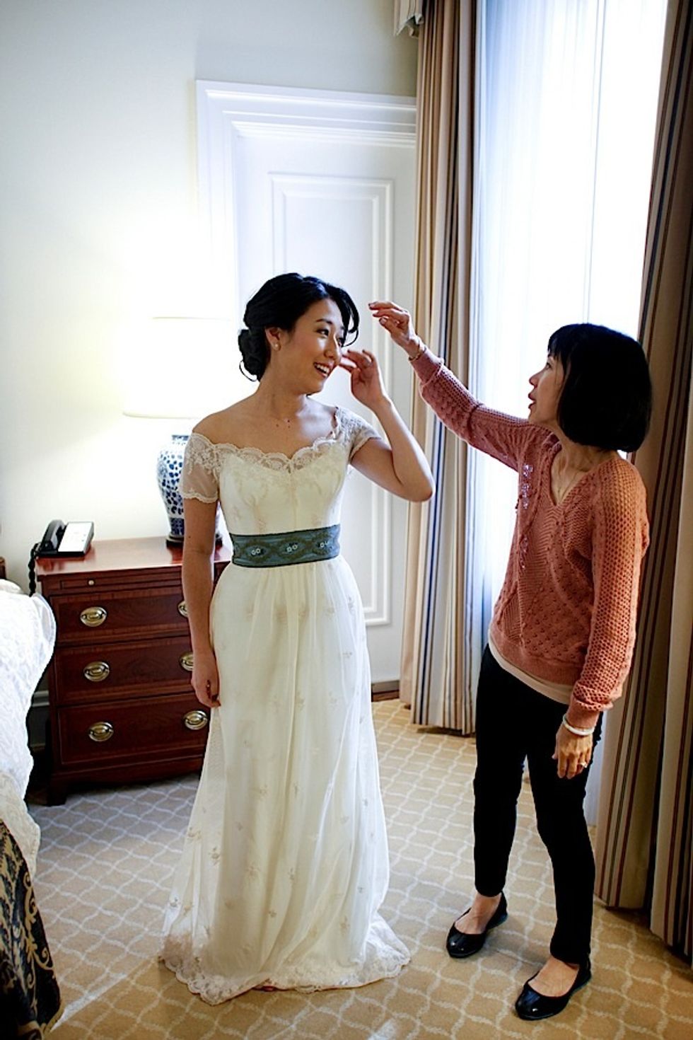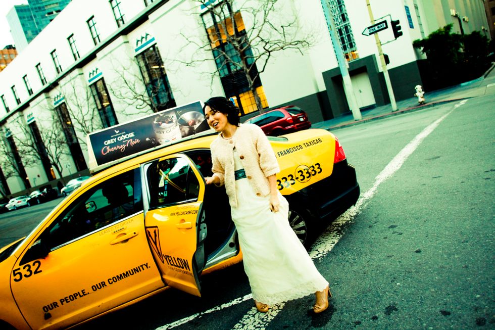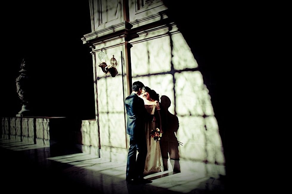 The bride looked wonderful in an embroidered gown with a lace, sweetheart neckline, and a unique turquoise sash around her waist. Before the ceremony at City Hall, the couple took to the streets of SF - snapping shots in front of MUNI cars and on street corners. The party was held at Boulevard where the party lasted late into the night.