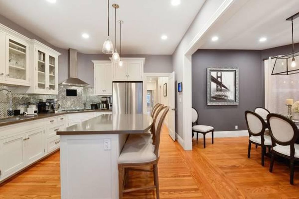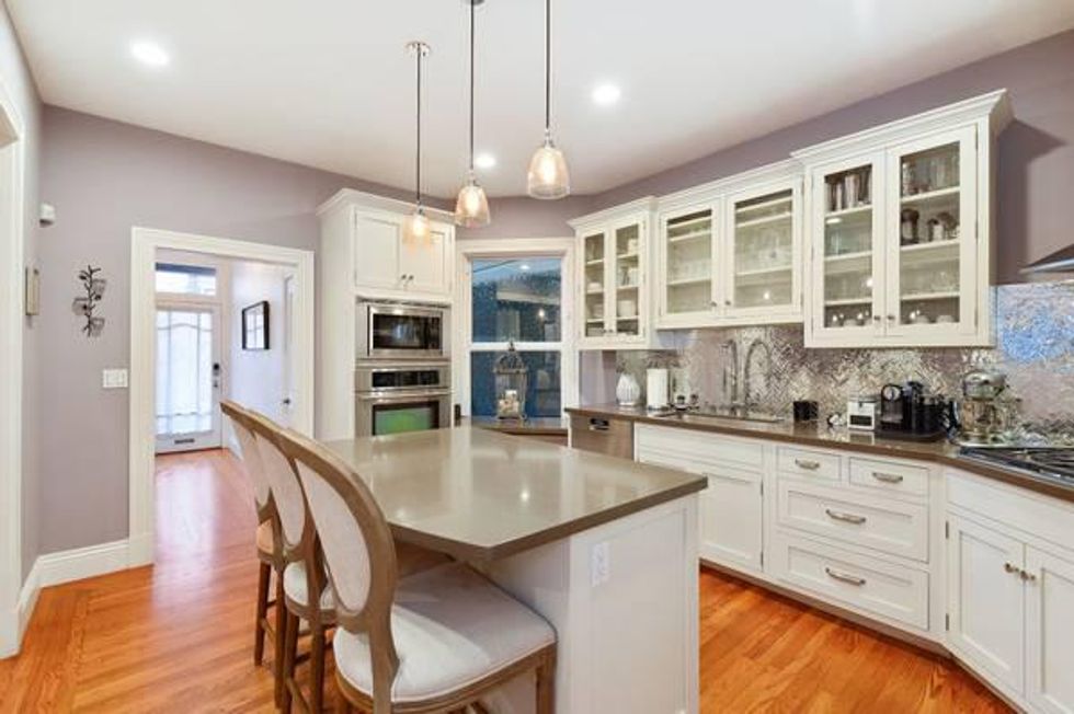 There's custom lighting and cabinetry in the kitchen, which is a great space for entertaining thanks to an island with extra seating.