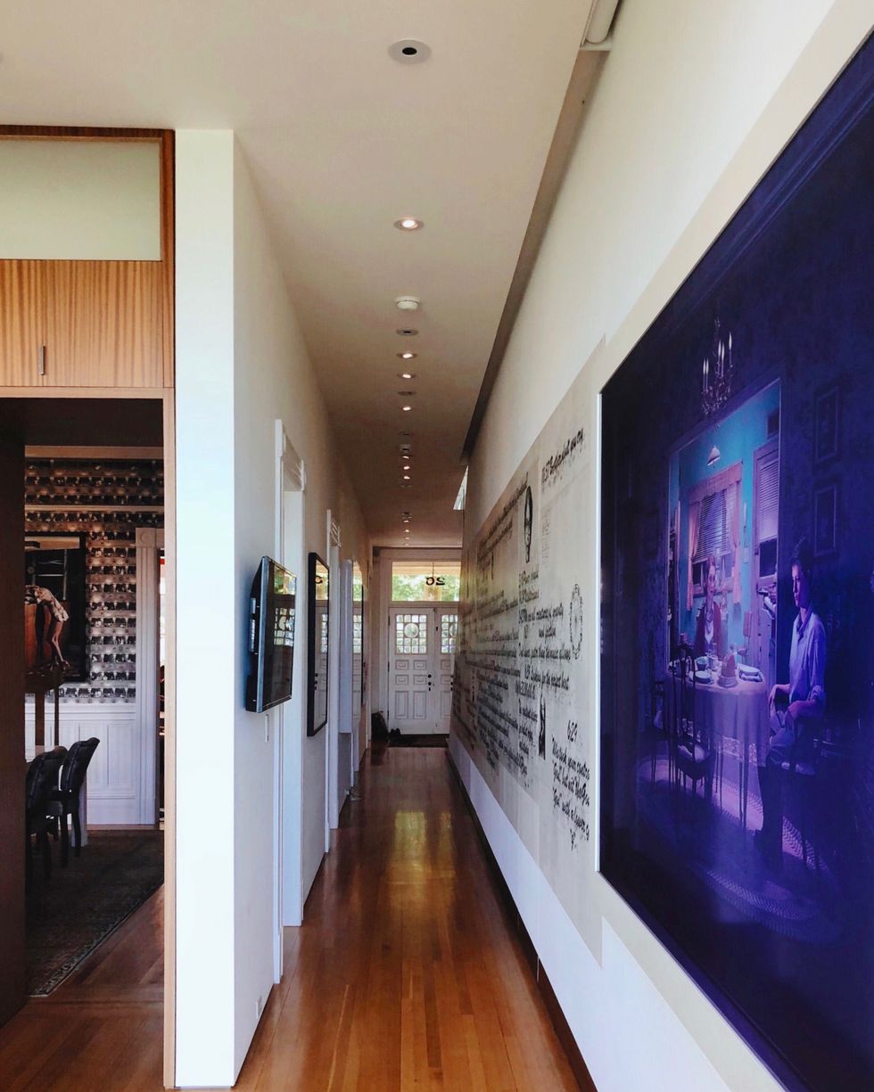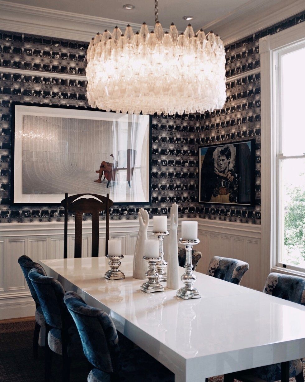 If you were seated in one of the plush velvet chairs beneath the sparkling chandelier in the dining room—a social area where a tall wooden chair marks the place of prominence for the father according to Vietnamese dining etiquette—you could read some sentences scrawled across Ewing's mural in the hallway. That is, of course, if you were able to look past the very eye-popping The photo on the wall is by in the room, as well as the wallpaper fabulously printed with images of theater balconies.