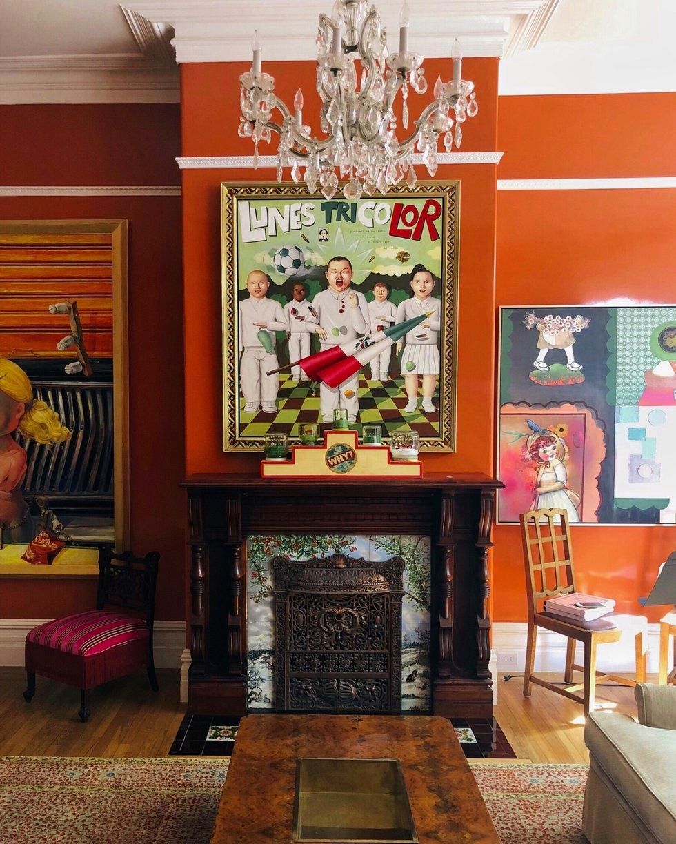 In the living room, the old Victorian's stately original fireplace, an ornate crystal chandelier, and tufted velvet furnishings lend a bit of old-world charm; but tomato-red walls, a few midcentury design details, and whimsical-to-say-the-least paintings stop that vibe right there. This is a thoroughly modern residence.