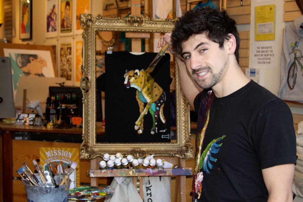 Upon stepping into Artillery Apparel Gallery, you're immediately faced with a huge, gold framed easel, holding a t-shirt, stretched like canvas, in various stages of painting. This is no upright screen-print job, but rather, hand-painted t-shirts by Artillery AG's owner, Ivan Lopez.