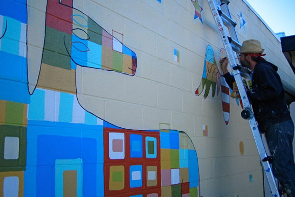 A statuesque two-headed horse, a winged man with a horse’s head and a three-eyed rabbit are all creatures depicted in artist Thomas Christopher Haag’s newest mural in Oakland. Using fine-line detailing and colorful symmetrical squares to fill and surround the animals, he gives this block-long artwork an unusual feel.
