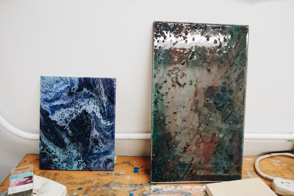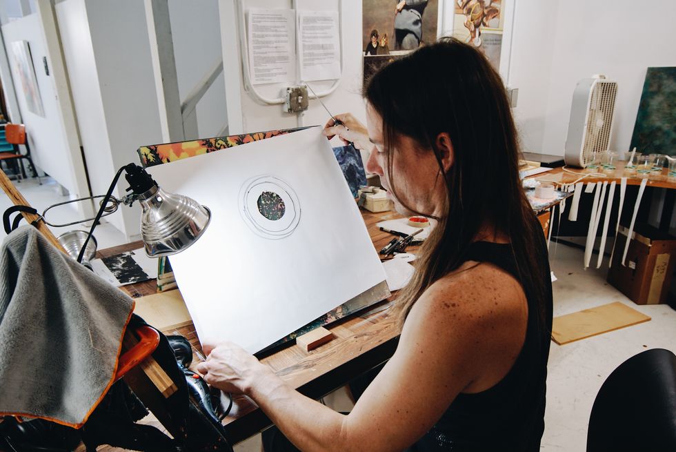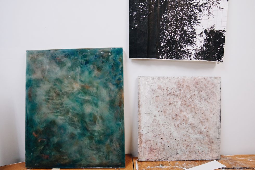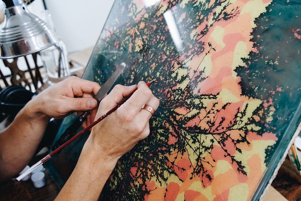 Medium: Teisl is a painter. Inspired by the beauty of the natural world and humankind's evolving artistic relationship with it, much of his art incorporates the trees he passes on his bicycle ride through Golden Gate Park and around the city. He uses both traditional and experimental techniques, exploring color and texture between the many layers of resin and acrylic paint that make up his pieces. This process forges the rich, dynamic viewing experience of his art; which changes dependent on your viewing distance and perspective. His backgrounds recall abstract environs from foggy skyscapes to cosmic swirls, and invite the viewer to draw connections between the environment immediately surrounding them and the greater scope of the universe.