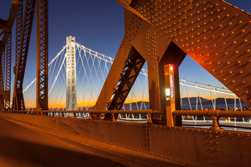 Photographer Michael Halberstadt has a rare relationship and history with the Bay Bridge. "I was on Treasure Island during the 1989 Loma Prieta Earthquake," he told us. "I got a California Highway Patrol escort back into San Francisco on the lower deck (heading in the wrong direction). To take these photos, I got a CHP escort going toward Oakland on the upper deck of the old bridge. Few, if any, people could say that!"
