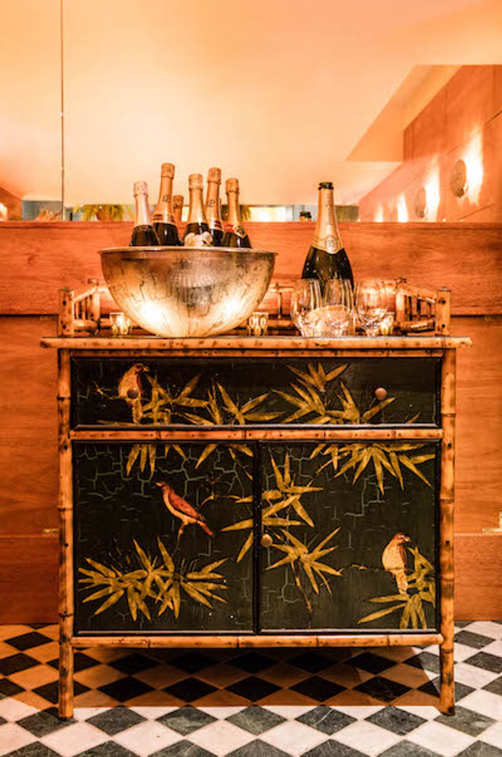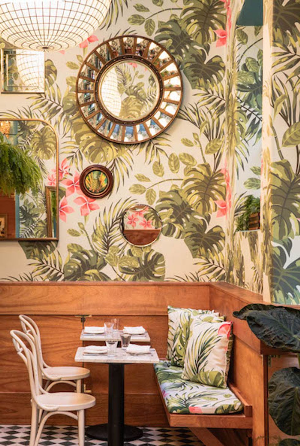 (Never underestimate the power of wallpaper! Just two days before Leo's was scheduled to open, Weinberg had a revelation: the paper that was to cover a back hallway absolutely had to be hung in the entryway. The result is a spectacularly feminine and tropical space, hung with glittering mirrors and ferns.)