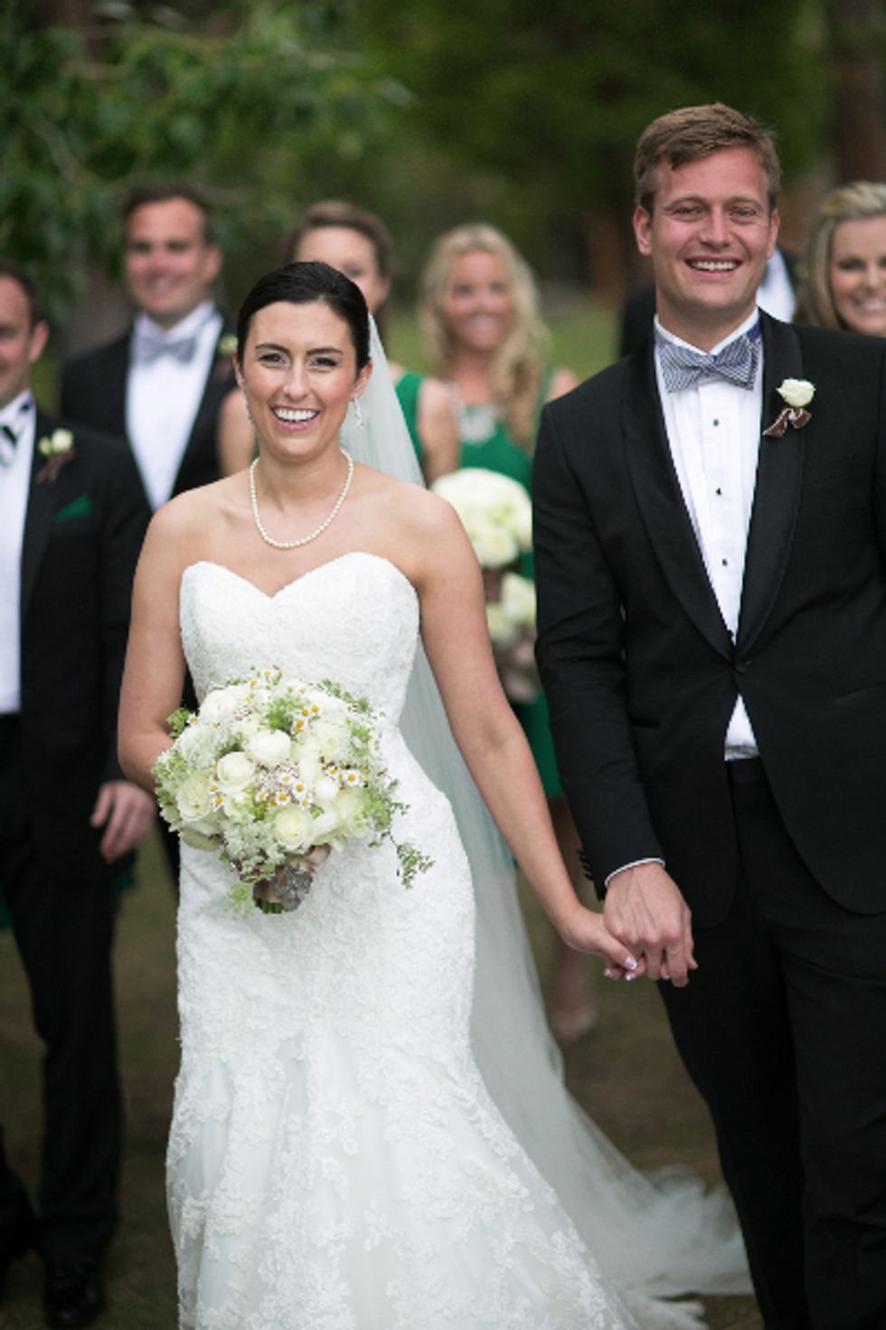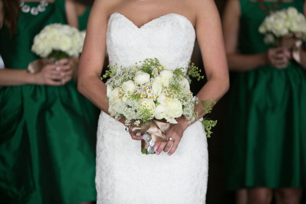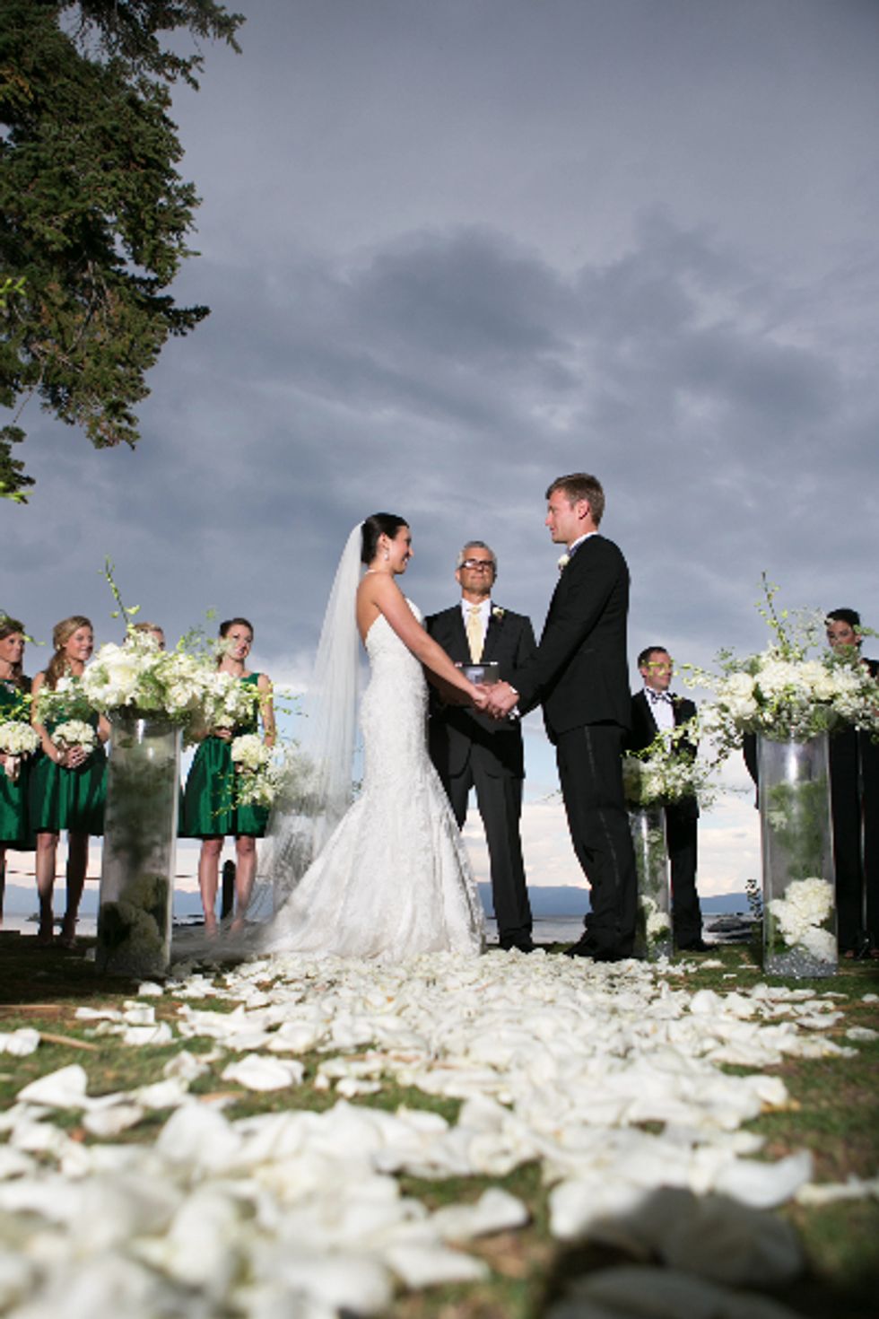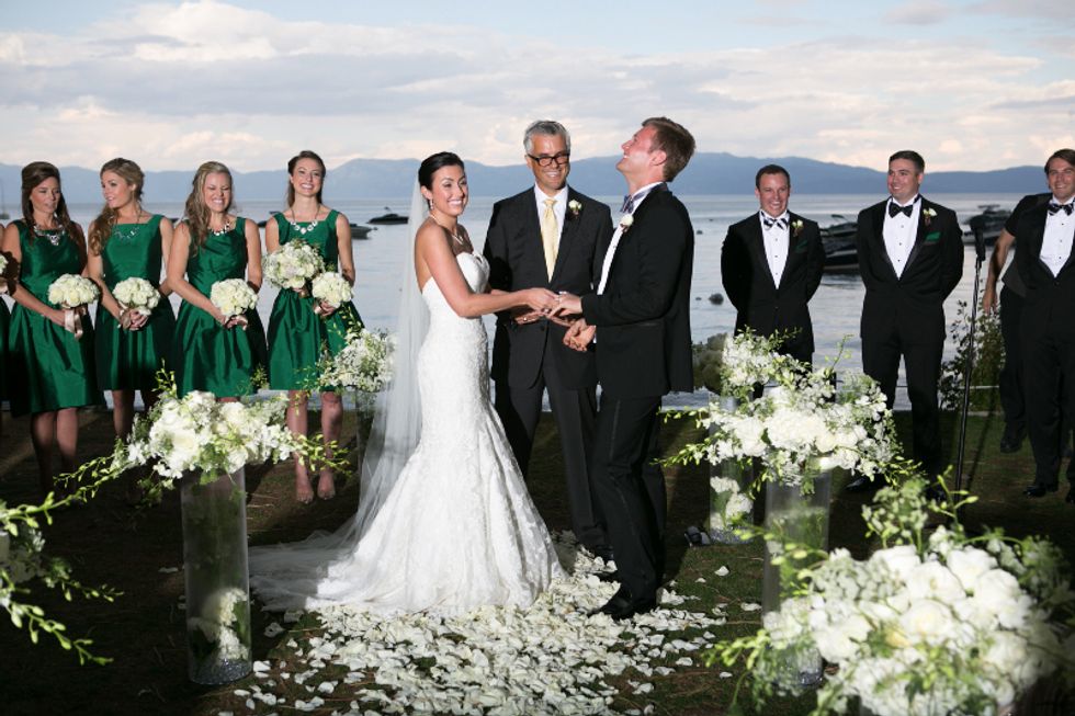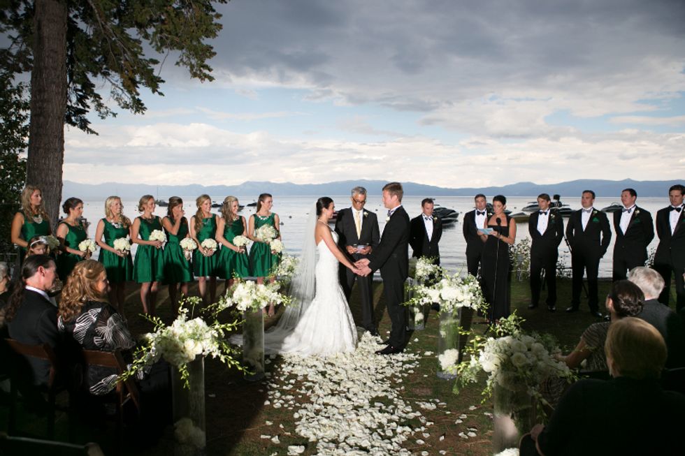 Alison's dad suggested West Shore Café as a venue long before she was engaged and the couple fell in love with it. Planning a wedding from 8,000 miles away was an adventure on its own, but luckily Alison's family was in California to help. To highlight the gorgeous venue and amazing back drop, Alison wanted to keep the colors simple and fairly neutral – using all whites and gold – but still have a bit of rustic glam. The bridesmaids dresses were the only splash of color – a beautiful emerald green that ended up looking fantastic with the lake as a background.