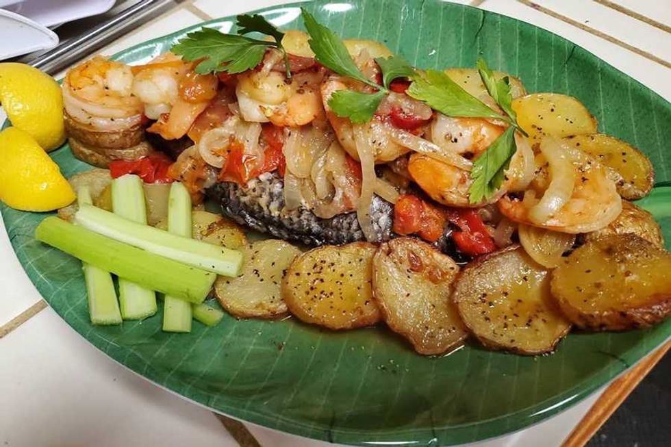 Golden Safari serves foods reminiscent of Aishada’s childhood. Puf-puf is a common appetizer made with meat, potatoes, and carrots inside of a deep-fried dough not unlike an empanada. She also serves a pepper soup that can be made with goat or chicken, one of many dishes made by cooking down ingredients such as bell peppers, tomatoes, and onions and adding spices and seasoning to create aromatic sauces. Foufou, a spongy starch commonly made from yams—the yucca type, not sweet potatoes—is also popular.