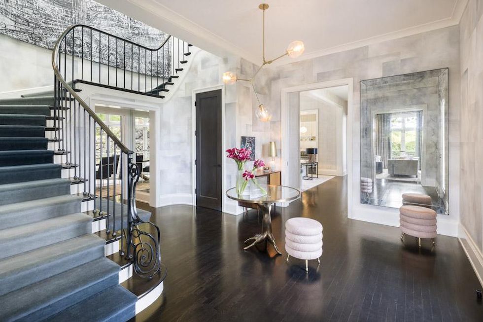 She and her team worked on virtually every room in Von Teese's unique 1920s English Tudor-style home, including painting the walls up the stairs to look like French lace; painting strands of pearls and tassels to look like they're holding up her artwork; and giving the kitchen walls a stunning green malachite treatment.