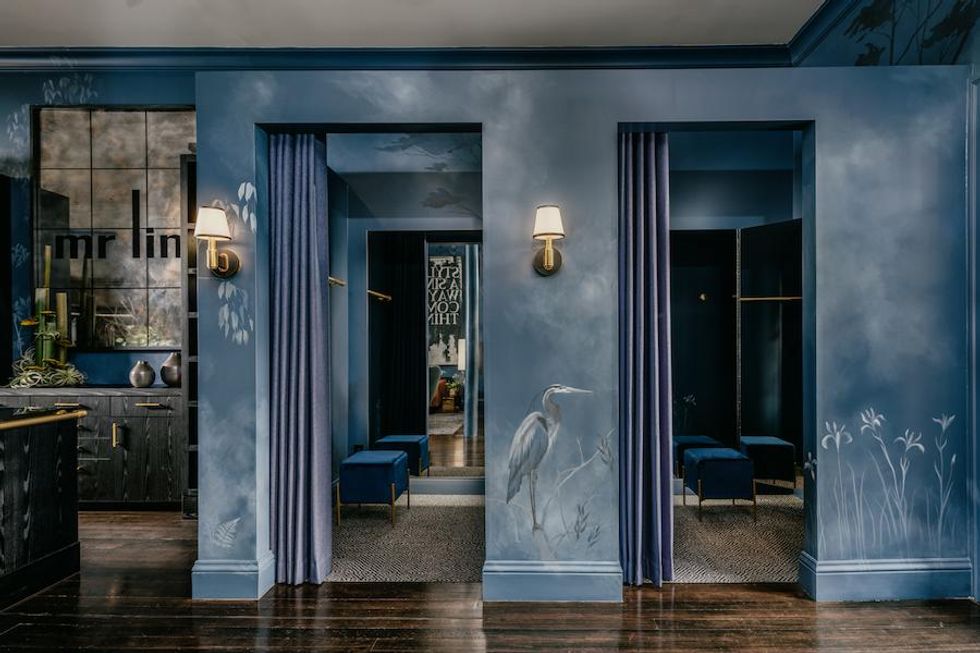 For Betty Lin's Mr. Lin menswear boutique on SF's Sacramento Street, Lizarraga treated the walls with a dusky seaside scene.
