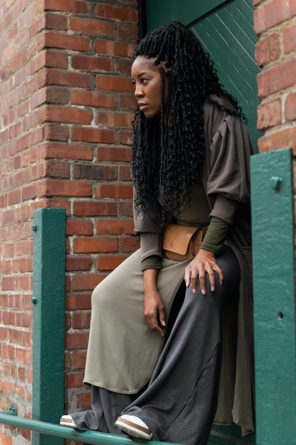 Taylor Jay loves to layer comfy knits that will take her through the day. Here she wears her Jojo slip dress, Willow pants, Dawn duster, and a fanny pack by Unoeth.