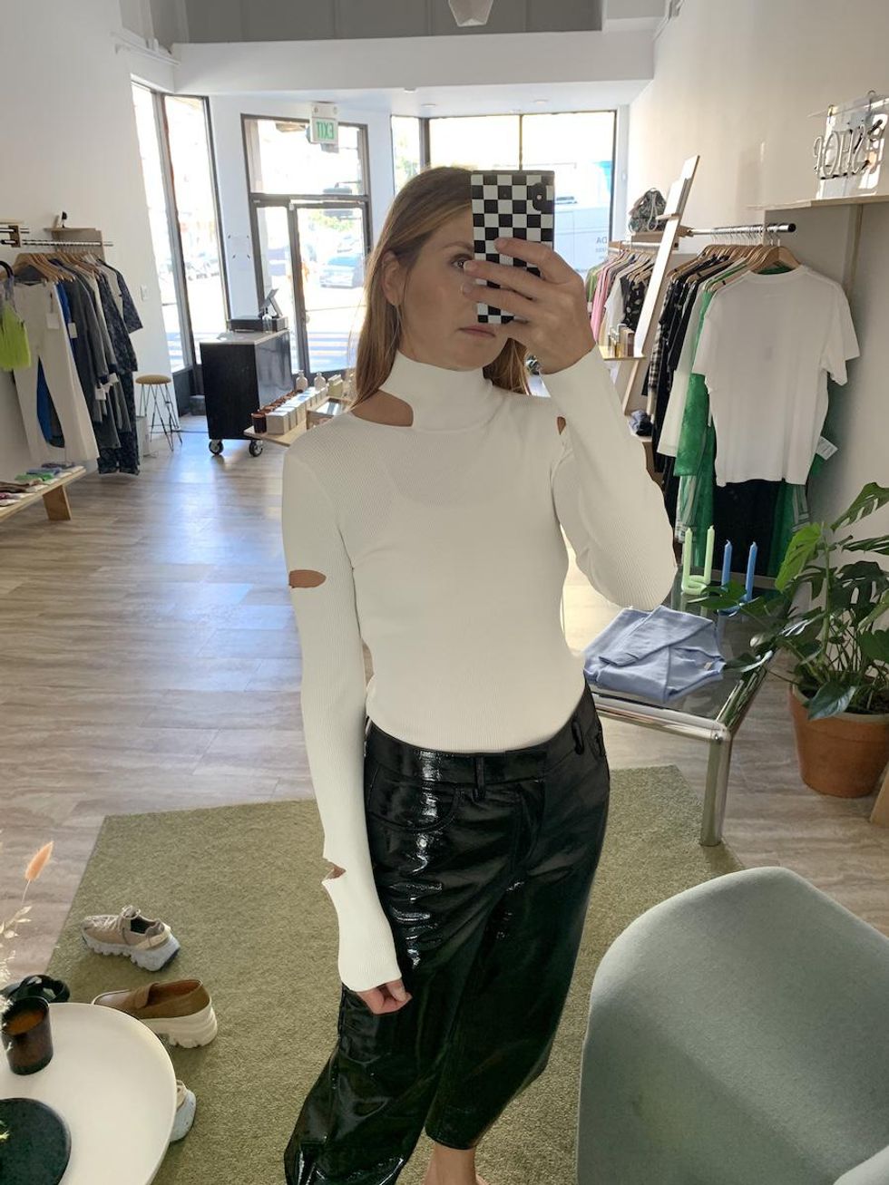 Le Point shop owner Pauline Montupet is well known for her selfies featuring the latest product drops, like this snap in Tibi's slashed knit sweater and faux patent leather Brancusi pants.