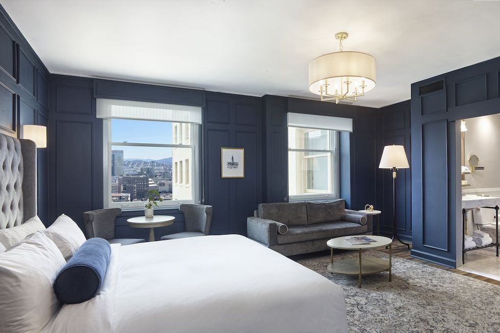 All the hotel’s rooms—including the smaller “classic” accommodations with their custom San Francisco landmark wallpaper and original marble tiled baths—had already been gifted with new sound-dampening windows and light-maximizing upgrades, wood floors with modern silver-toned area rugs, and large LED TVs with Chromecast and high speed WiFi.