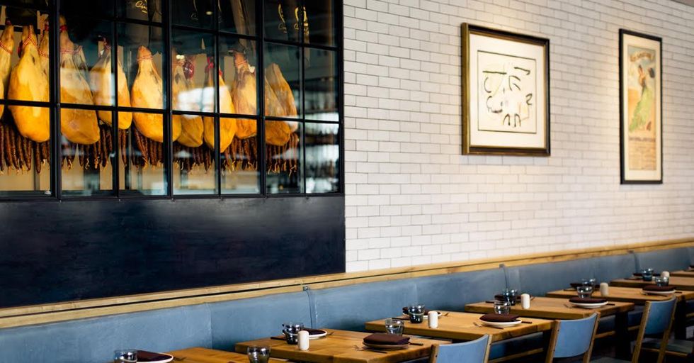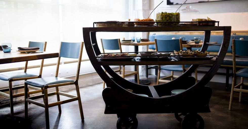 As soon as you slide into one of the oversize booths or sidle up to the chef's counter, the snack cart comes around, with its irresistible bounty of cheese cubes marinated in olive oil and herbs, spiced marcona almonds, and gilda pincho (skewers of anchovy and olive). You order a little of everything to graze upon while you mull over the rest of the menu. Judging by the way you impale your toothpick into another, and another, and yet another cheese cube like you're ravaging the samples at Whole Foods or Costco, ordering the Queso del Dia may have been an amateur misstep.