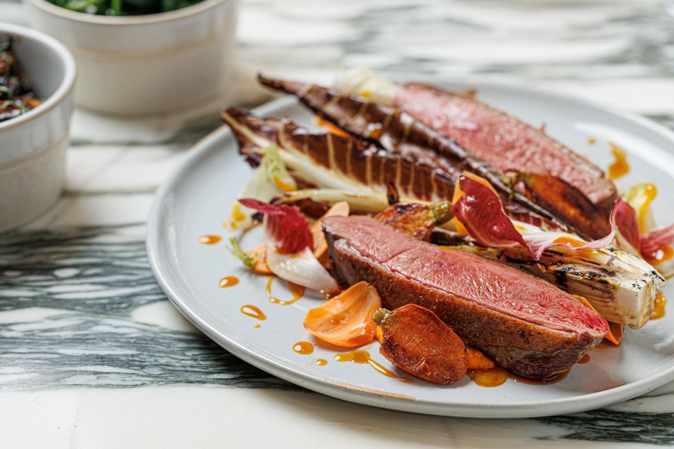 Roasted Liberty duck a l'orange with thumbelina carrots and grilled summer chicory at La Societe in the Hyatt Regency SF Downtown SoMa