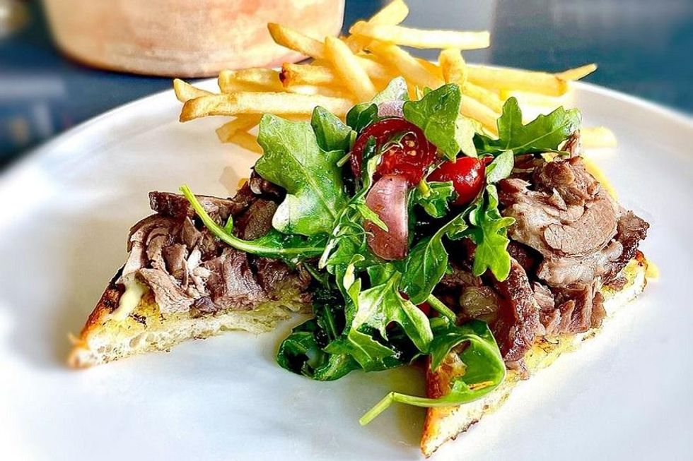 Occitania's tartine d'agneau confit (lamb confit, grilled sourdough, arugula, cherry tomatoes and aioli with frites)