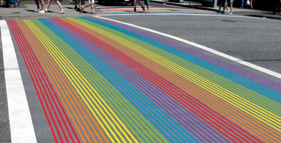 As part of an overall neighborhood improvement project, four rainbow crosswalks are being added to the intersection of Castro and 18th Streets. Slated for completion later this year, the crossings (a partnership between the Community Benefit District and SF Department of Public Works) are geared toward slowing traffic and fostering even more joy in the already vibrant and historic ’hood.
