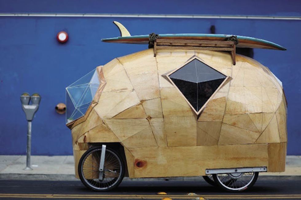 You could think of SF artist Jay Nelson’s plywood campers as the kind of ad hoc, nomadic shelter we’d cook up in the wake of the apocalypse. “I really like the idea of ‘making do,’” says Nelson, who is represented by Triple Base Gallery in the Mission. Car Camper was built on top of a junked Honda Civic, the Honda Spree Study in Temporary Autonomy is a customized moped with canvas privacy shades, and The Golden Gate 1 is an electric car equipped with a water tank, stove, fold-down table, and convertible bed. Of course, if the requisite surfboard storage atop each camper proves anything, it’s that minimalism is subjective.
