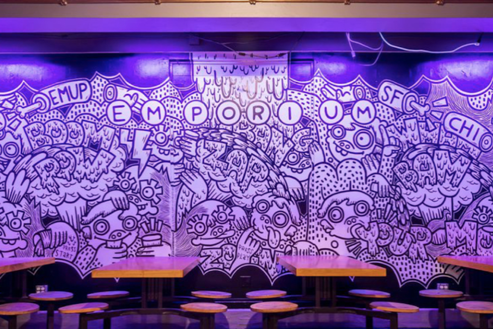 SF muralist Lauren Asta painted the lobby of the new Emporium Arcade Bar with an appropriate scene: a playful mess of characters drinking, laughing and having fun. This is Asta's signature style, a way of keeping her sense of humor about the human experience. She completed the project in just two-and-a-half days, but the wall is incredibly all hand-painted. The work combines her skills as an illustrator, doodler and graffiti artist, and is the just-right backdrop for playing pinball and pool. The Emporium actually houses works by a number of interesting artists including another local, fnnch. // Emporium Arcade Bar, 616 Divisadero St. (NoPa), emporiumsf.com
