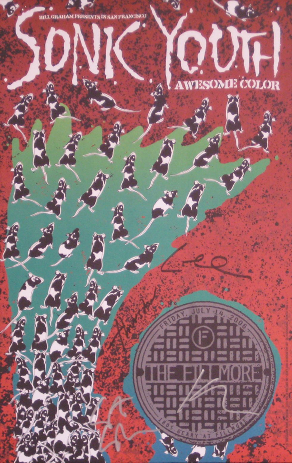 Like the Pixies for indie darlings, the alt-rock community has a lot to thank Sonic Youth for. Their influence in the NYC music and art scene in ‘80s re-shaped what was once though of as limitations for rock, and has since remained an esteemed cultural institution. Case and point, this Todd Slater Fillmore poster from 2006’s sold-out show, which was created almost an entire quarter century after the group’s inception.