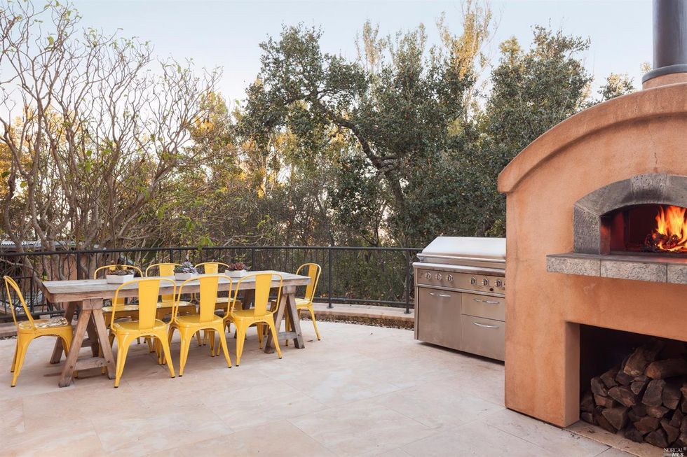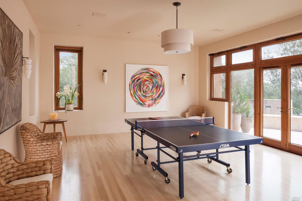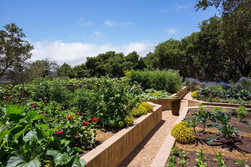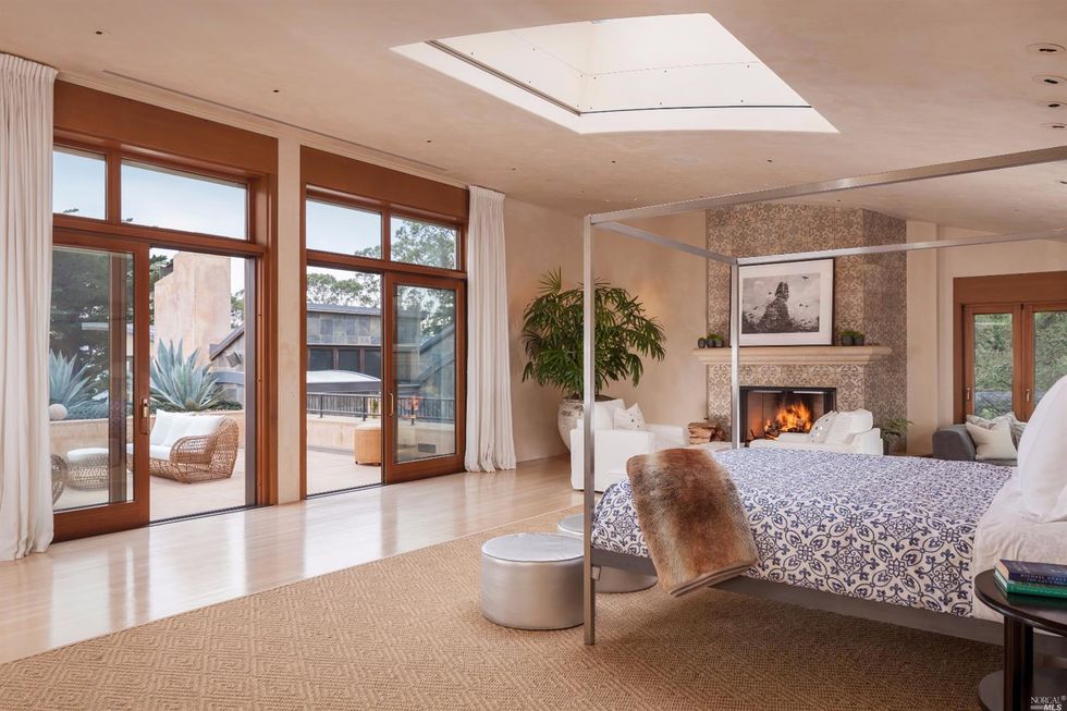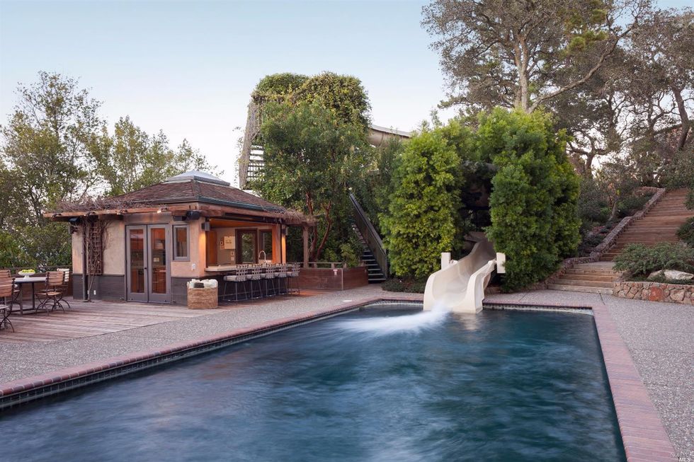 Designed by green architect Sim Van der Ryn, the pied-à-terre has something for everyone—a water slide, music studio and home theatre, regulation racquetball court, and an extensive organic garden with orchard and greenhouse. Clean interiors include a muted peach palette, plentiful natural light, hardwood floors, and multiple fireplaces that exude a warm energy through the sprawling space. An outdoor kitchen and deck are an entertainer's delight for cozy nights; and afterwards your guests can stay in the 2 bed, 2 bath guesthouse.