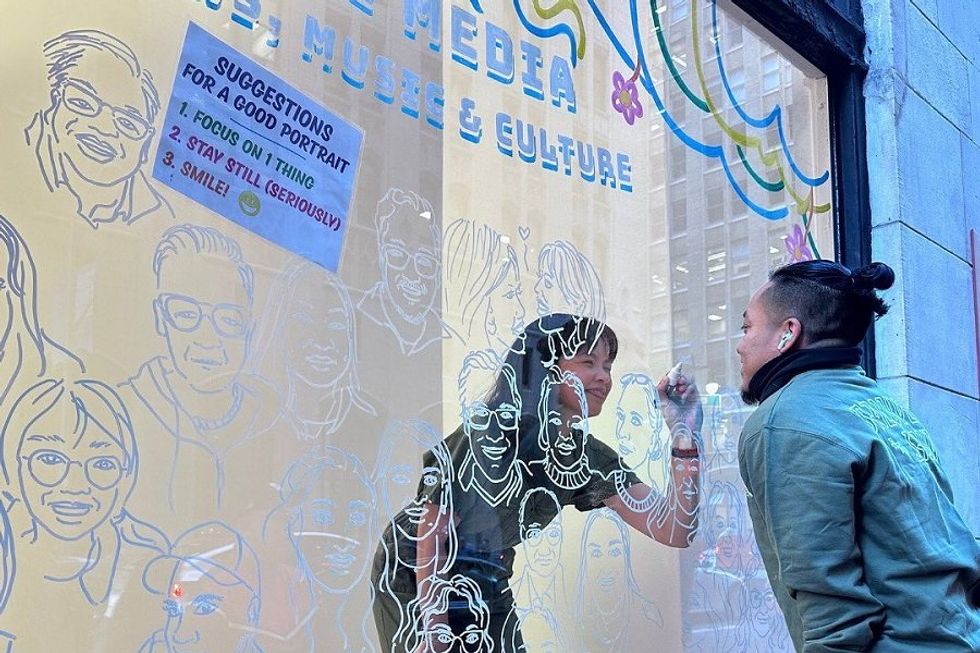 Vacant to Vibrant pop-up activator artist Bee Betwee at work on a community portrait mural.
