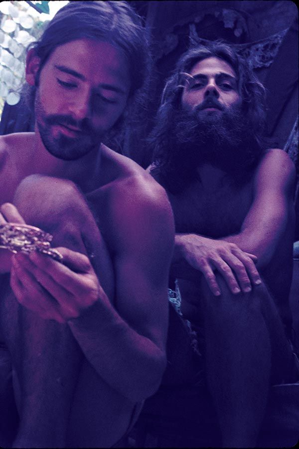 For Hart, whose funk and flash endeavors began with the elaborate embroidery of mishmashed motifs onto clothing—flowers, crescent moons, rainbows—much equanimity was gained through the physical act of sewing. “There’s nothing like it to calm the mind,” says the Sebastopol resident. Her longtime friend, self-taught shoemaker Mickey McGowan (aka the Apple Cobbler), known during the free love decade for his kitschy brocade boots stacked with four-inch-thick rainbow-colored foam soles, concurs. “I couldn’t control Vietnam. I couldn’t control the Bay Area’s volatile environment. So I just quietly made things,” he says. “Sometimes the only way to ride out the storm is to sit peacefully in the eye of it.”