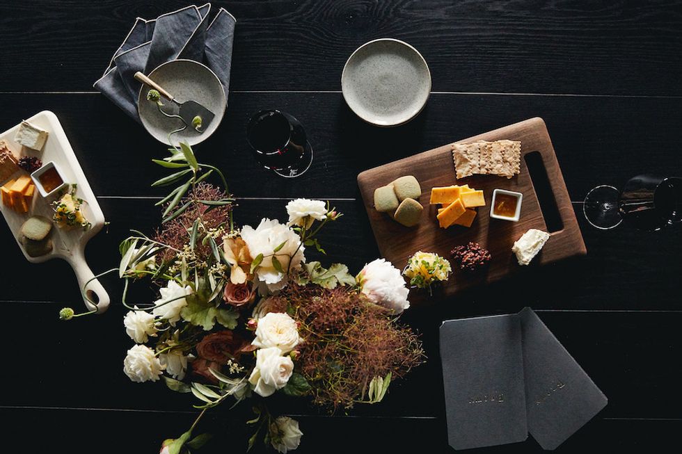 The team wanted a place where "everyone is welcome and wine is not so stressful," even for newcomers to the tasting experience, says Deneen, who gushes about Kwong's work. "We absolutely love the way we feel when we're in a space designed by Catherine," she says. Beyond the sexy, dark colors and distinct layout, which includes two bars, bench seating, and a lounge, the decor also gives a meaningful nod to the family. Taking pride of place behind the tasting bar is a drawing by the Browns' Uncle Buntin, who's described as a "mystical figure," a wanderer, and a "dashing guitar-slinging charmer." He left the drawing at the estate years ago with no explanation.