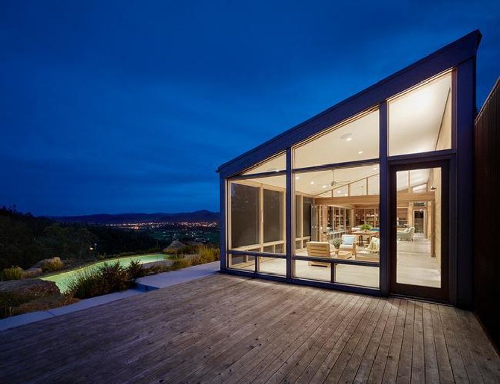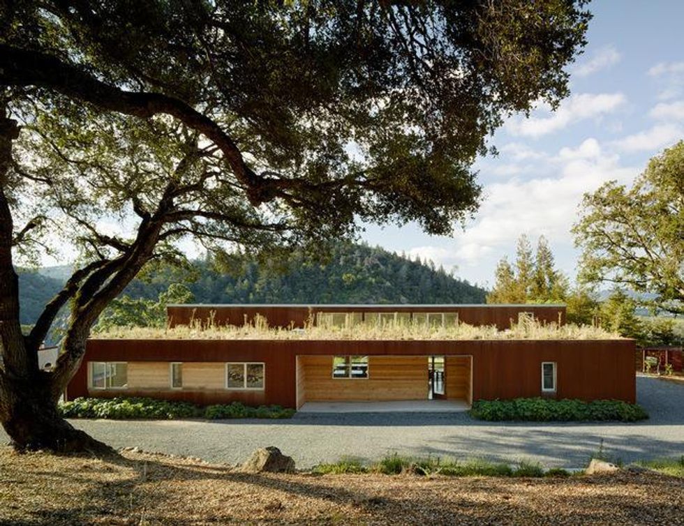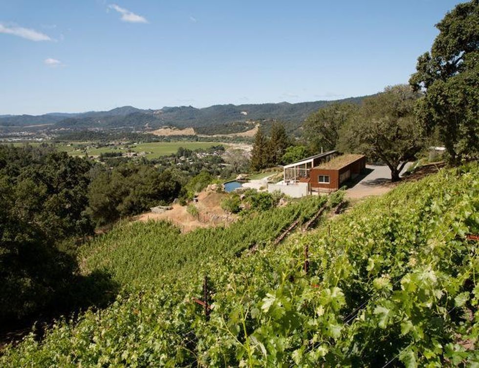 Falling for a stunning valley view surrounded by vineyards was the easy part for these California homeowners. Figuring out what to do with the dark, uninsulated log cabin kit home on the site was the hard part. Without a visual or physical connection to the landscape, the cabin didn't seem worth overhauling. Instead, the homeowners decided to build a new home using the wood from the cabin to create something with a more cohesive relationship to the site.