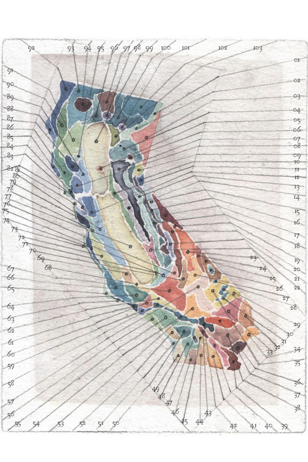 And while the paintings and maps are meaningful to anyone who identifies as a Californian, they belie the reality of the state of the wilderness: "The natural world in California is in need of some major love and caring from humans," says Kaufmann.