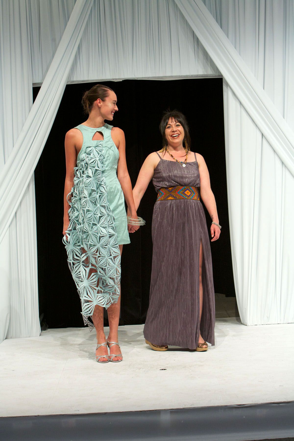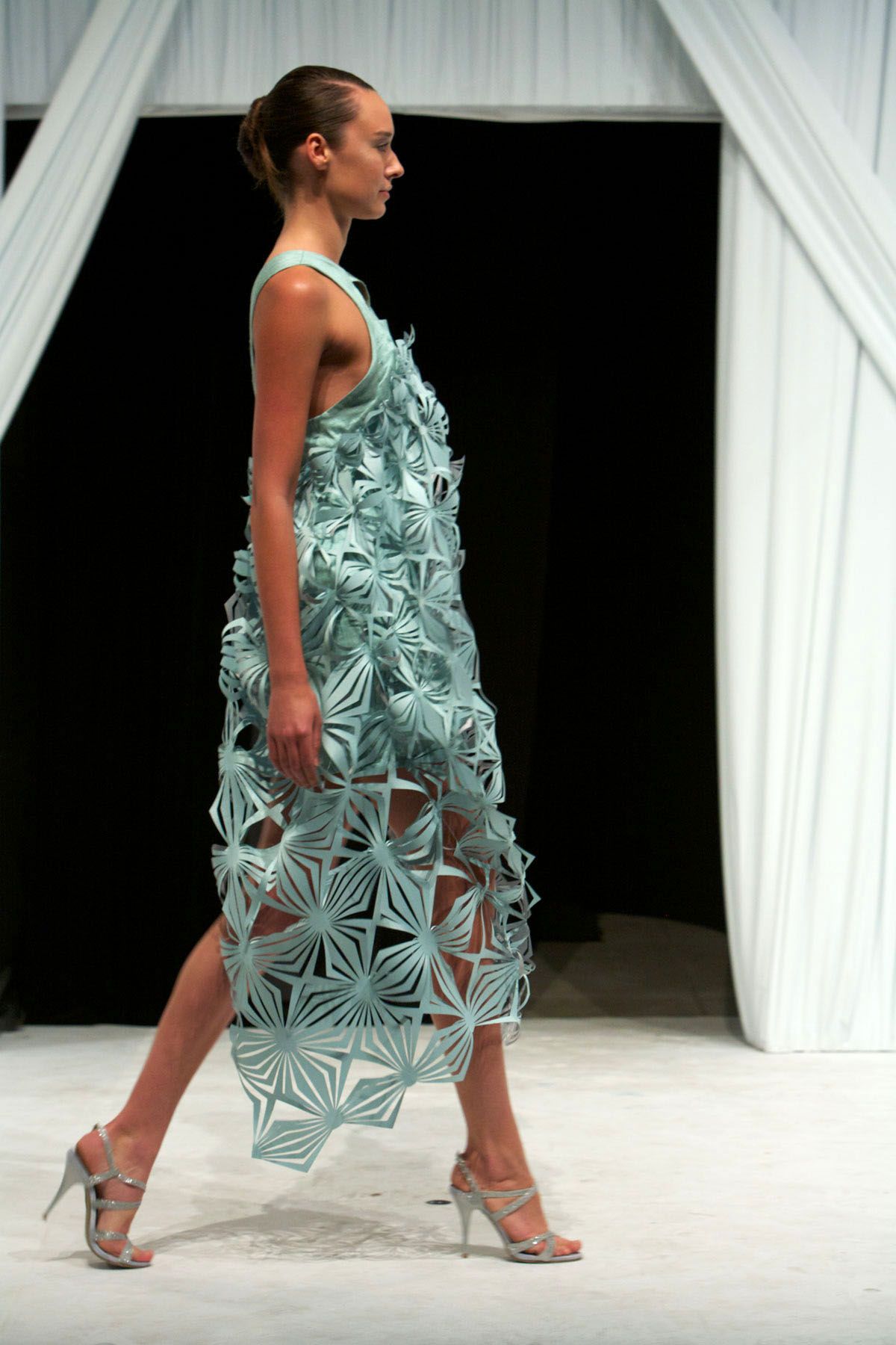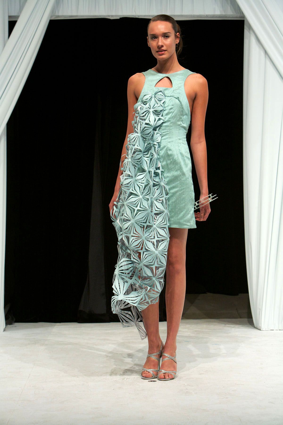 Tisina T. Parker created her collection, titled 4th Dimension, using mathematical algorithms based on geometric patterns. The patterns are inspired by Native American textile traditions and aesthetics, but with a contemporary twist; she is particularly influenced by the fashion designers Iris van Herpen and Issey Miyake.