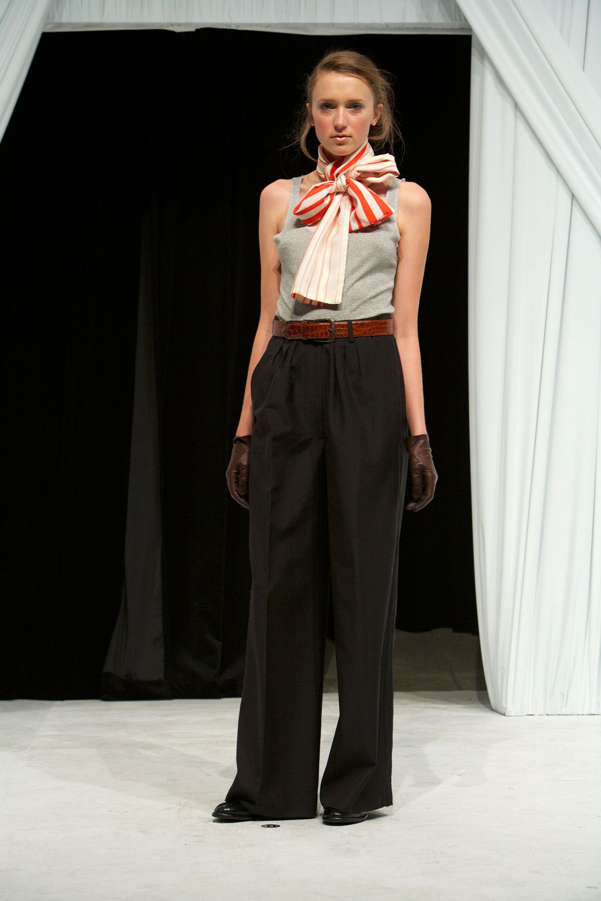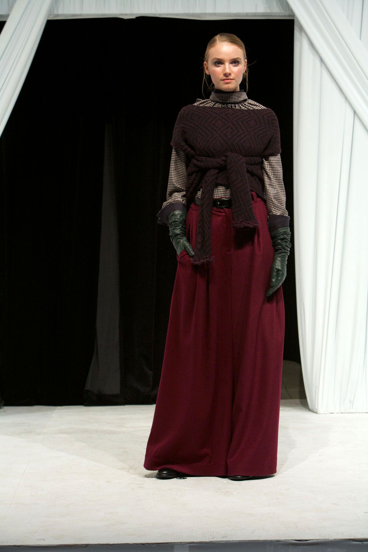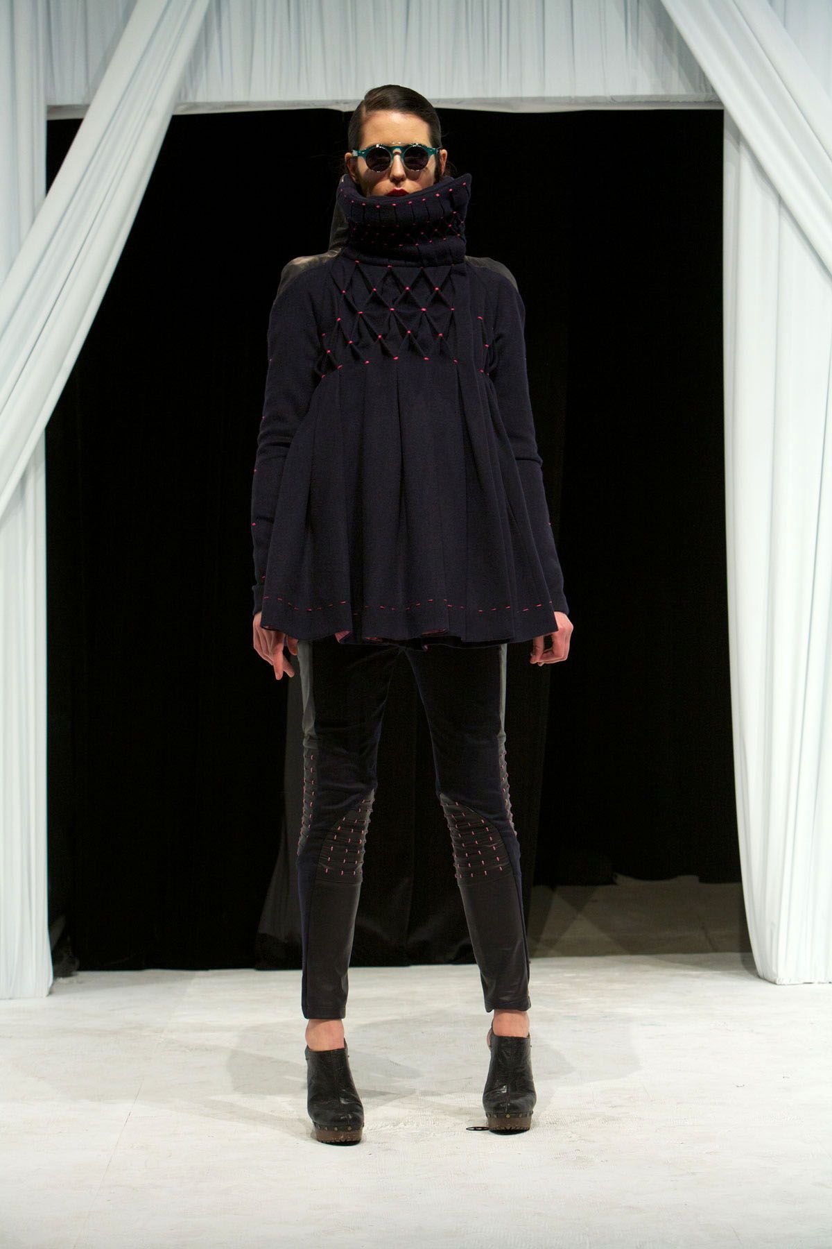 Irina Murphy emphasizes the physical and metaphorical fragility of human beings via clothing that represents shelter. The pieces in her collection, titled Haven, cover most of the body -- even serve to hide a person's identity -- via high necks, long sleeves, and sunglasses. They are made from wool, leather, and silk, with a great deal of hand embroidery.