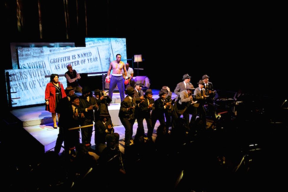 Champion—produced by SFJAZZ in conjunction with SF’s groundbreaking and ever original Opera Parallèle with a score from trumpeter and composer Terence Blanchard—tells the tragic (and true) story of Emile Griffith, who went from teenager with dreams of becoming a hat maker in St. Thomas to U.S. welterweight champion of the world. In 1962, enraged after being taunted by his opponent Benny Paret at their pre-match weigh-in over Griffith’s reputation as an out and about homo (or maricón, as Paret calls him multiple times in Champion), Griffith knocks him out so violently that he never recovers consciousness and dies in the hospital 10 days later. Champion skitters between Griffith’s boyhood, his later days of regret and dementia, as well as his ’70s prime as disco daddy/lothario enjoying the attention of both sexes (hence the eye-popping green suit!).