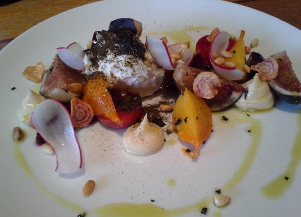 The Mission's seven-year-old Maverick has a new chef, Emmanuel Eng, who has infused the menu with new creativity. His beet and burrata cheese salad contains a hunk of burrata covered in fig leaf ash, accompanied by Zante grapes, pinenut butter and radish. Eng roasts the fig leaves until black, then crumbles it up to create the ash. He explains the origin of the technique: "Traditionally, in the Loire Valley in France, cheeses are covered with oak charcoal to mellow acidity and to help the surface be more hospitable to the growth of molds that add to the complexity of flavor. The fig leaf ash has a mellow bitter taste that is slightly sweet, very similar to that of cocoa powder, and has a strong aroma of grilled fig leaves. I like the flavor because it plays nice counterpoint to the Zante grapes and beets which can be quite sweet."