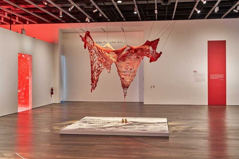 Shiota was born in Osaka in 1972 but has spent most of her adult life in Berlin. It was there that she gave birth to her daughter, there that she lost an unborn child, there that she survived two bouts of ovarian cancer. In the exhibition, she captures those experiences in thread and wire and rope and leather—always in red, a color of significance in many East Asian cultures: Beyond My Body encapsulates the feeling of being physically stuck by illness with an active mind that is still able to disconnect and reach outside; in the Cells series, she imagines the alien entities of the cancerous bodies inside of her.