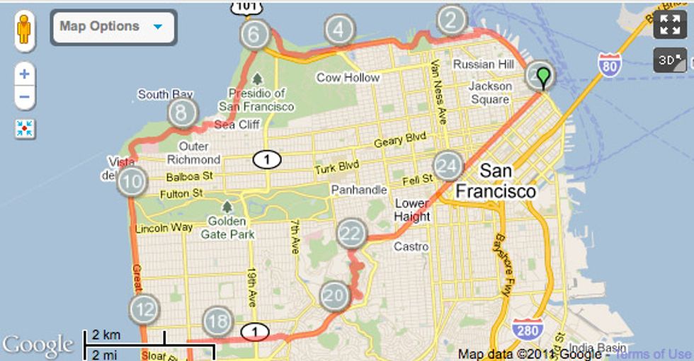I usually equate the Ferry Building with good eating, but on this windy day, the Mojo crew suggested it serve as the starting point for my cross-city ride. The flat Embarcadero is perfect for intervals and got my legs pumping right out of the gate. Heading north, I turned onto Beach Street and up to Fort Mason.