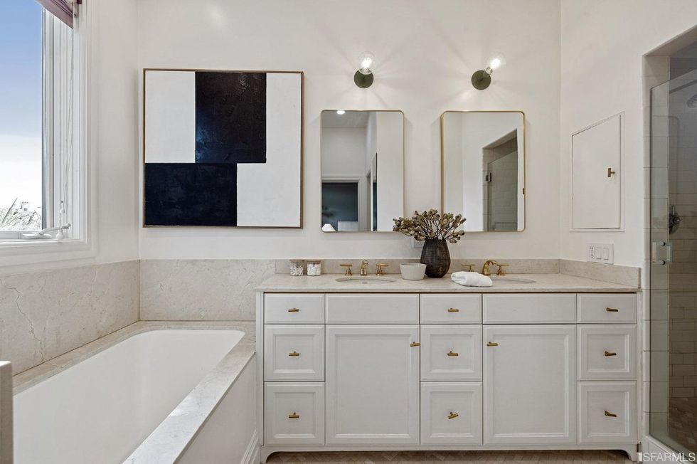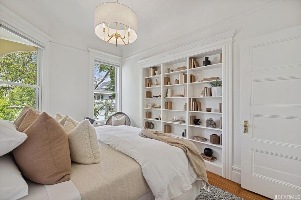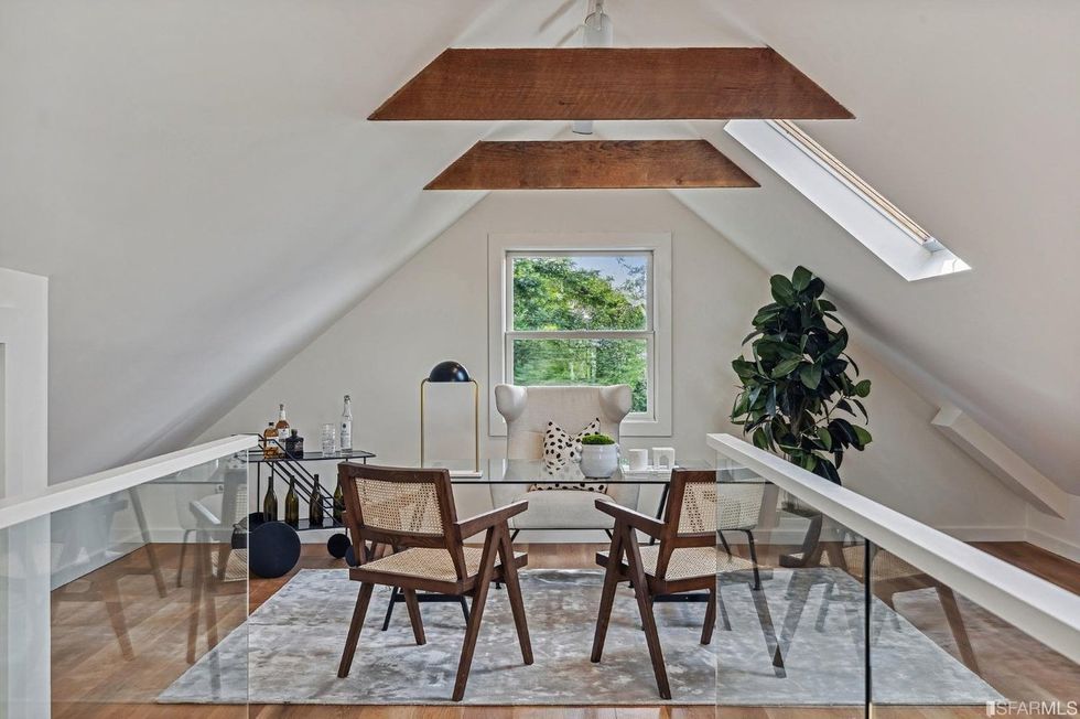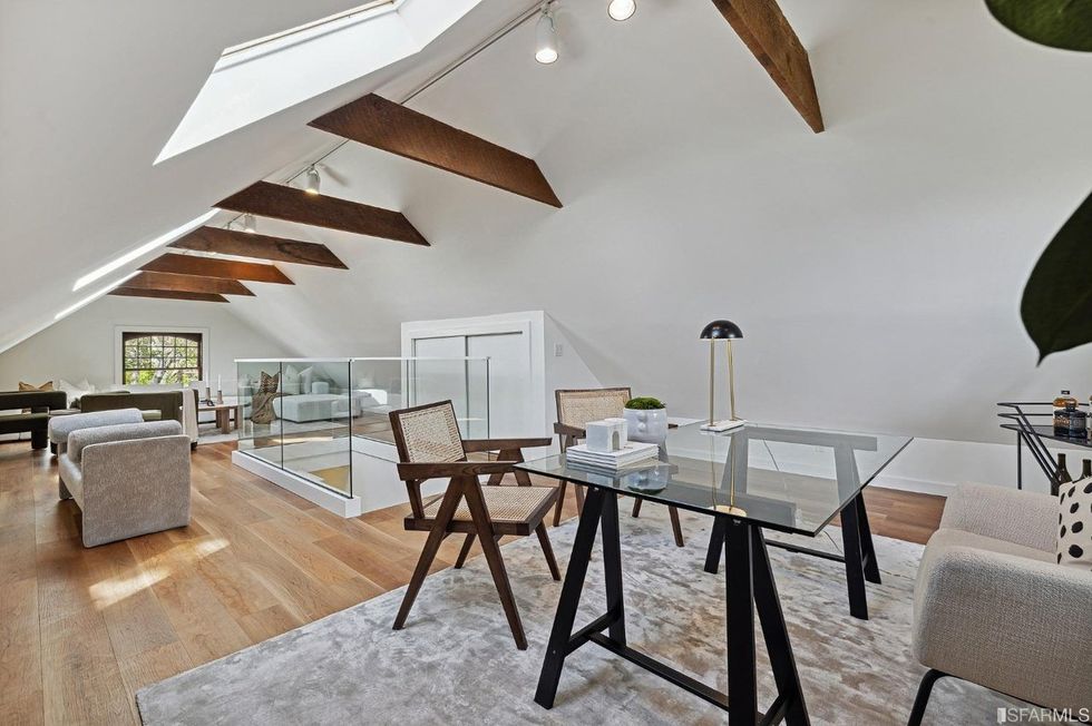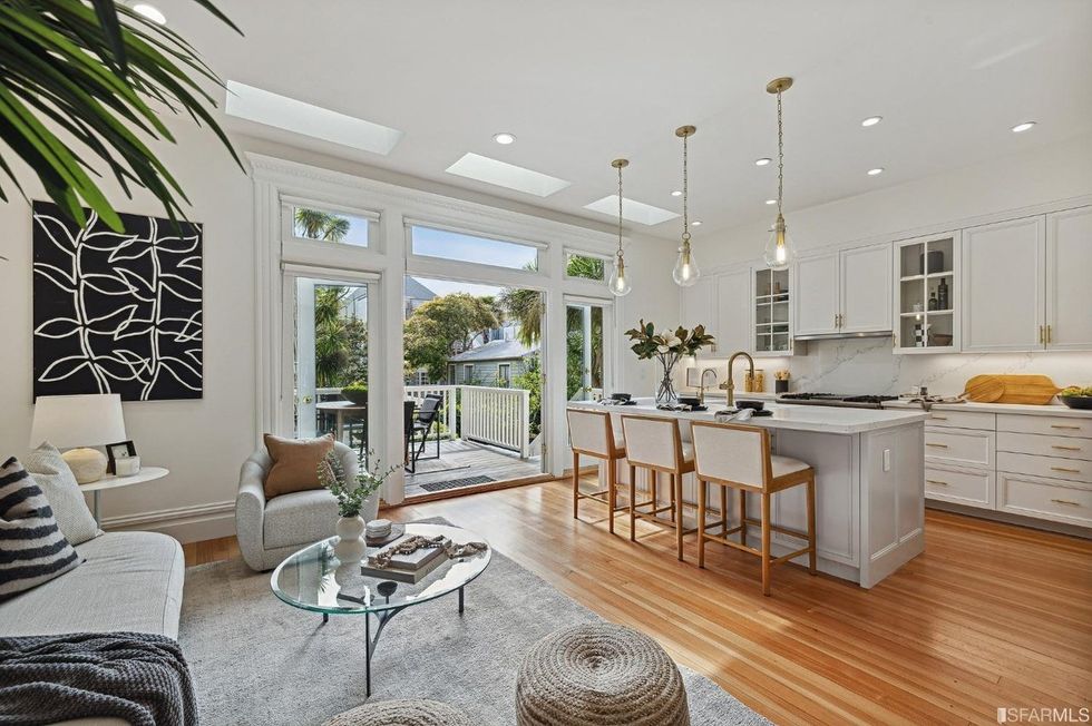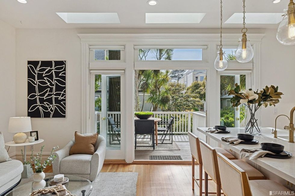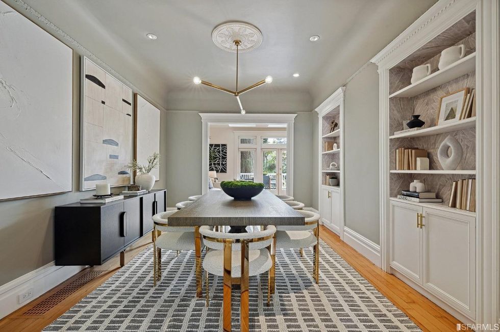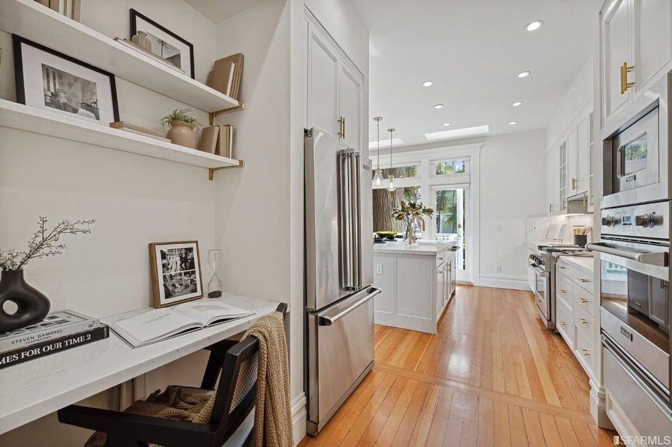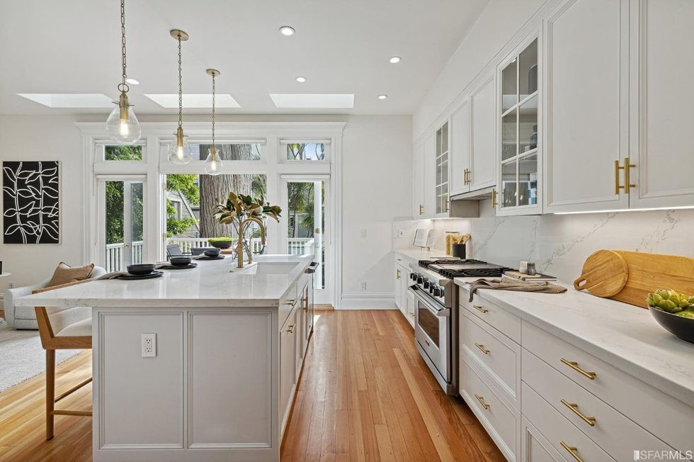 Intricate ceiling detail transitions the living space into the formal dining room where pretty built-in shelving provides an opportunity to display collections of art or dishes. The kitchen is chic and bright in all white with high-end brass fixtures and gleaming Viking appliances. A trio of pendant bulbs hangs above the large island. The kitchen will always be the center of the action thanks to an adjacent sitting room and a workspace off to one side. Three skylights lead the way to a deck with backyard access.