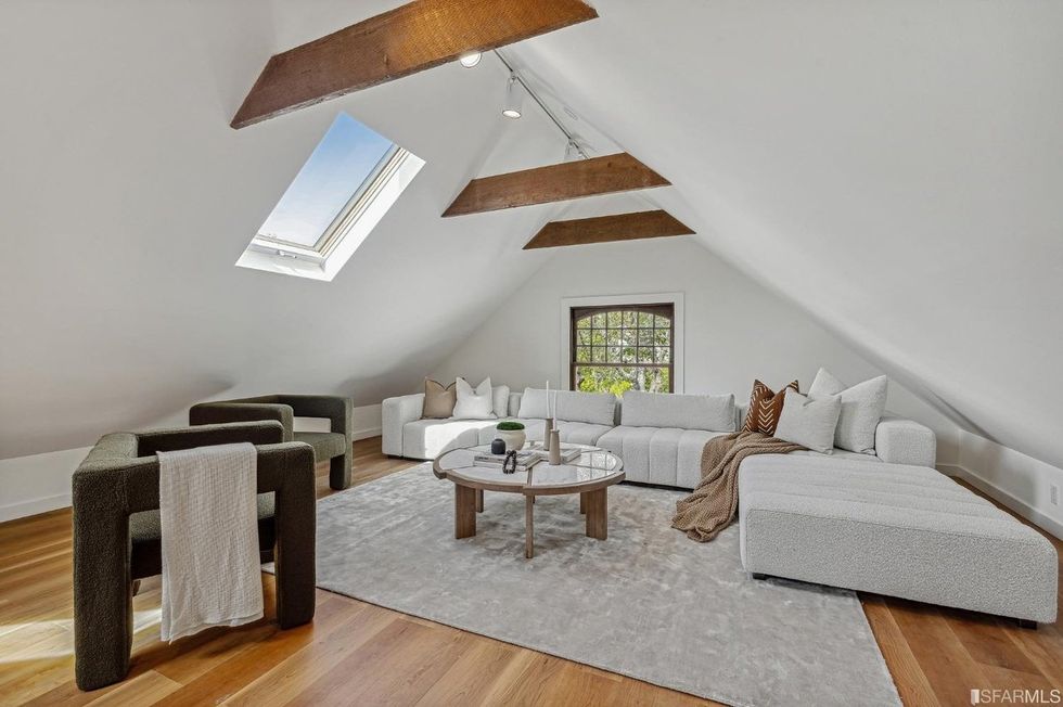 High coved ceilings let in ample natural light on the top floor which has original trim and wainscoting, recessed lighting, and hardwood floors. It's an ideal space for a family room, home office, or fitness area. Closet space here offers extra storage.