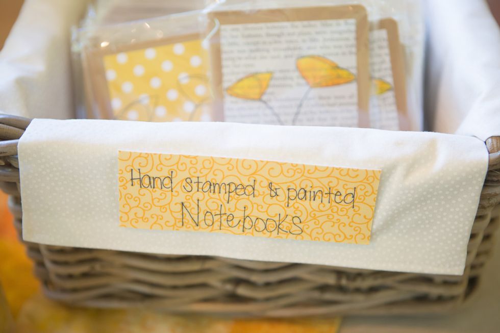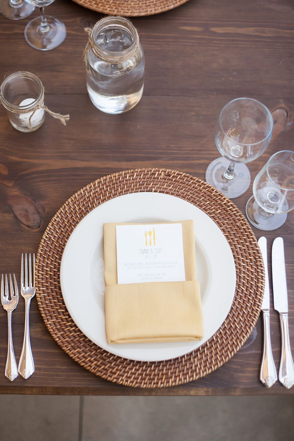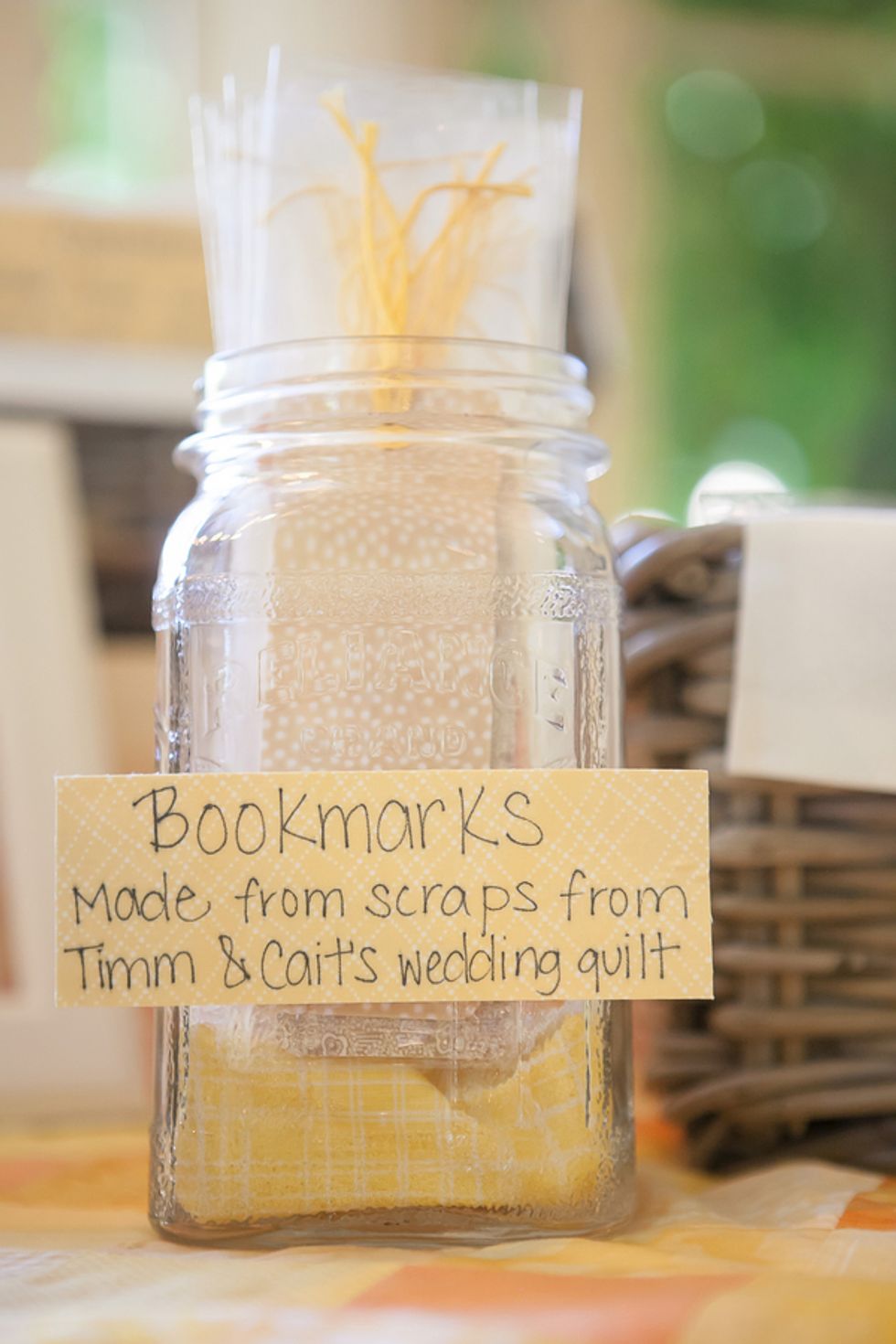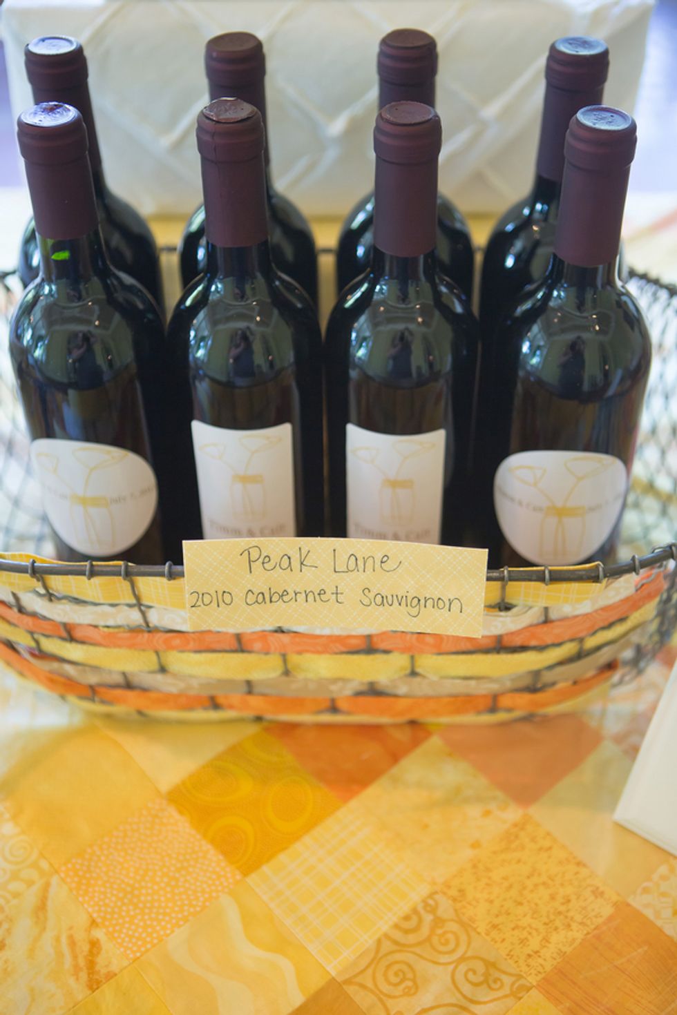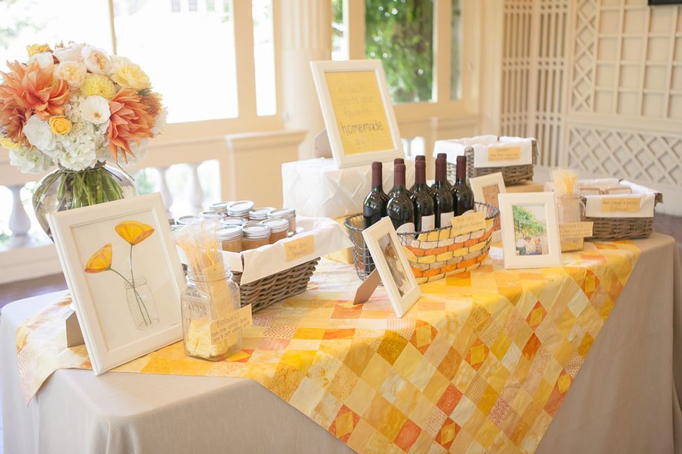 A bright yellow poppy bouquet (in a mason jar, of course) was the motif used on the invitations, menus, and other printed goods. The bride's mom even hand-sewed Cait and Timm a wedding quilt in their wedding colors: bright yellows and oranges. The scraps left over were used for escort cards and favors. On the back of each card was a handrwritten personal note to the guest from the bride and groom.
