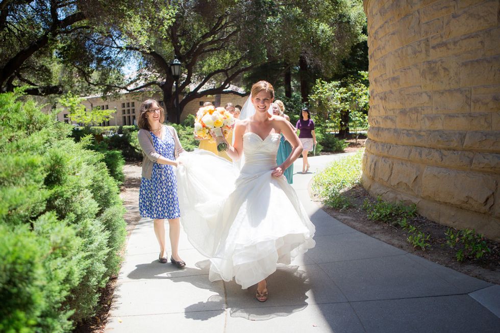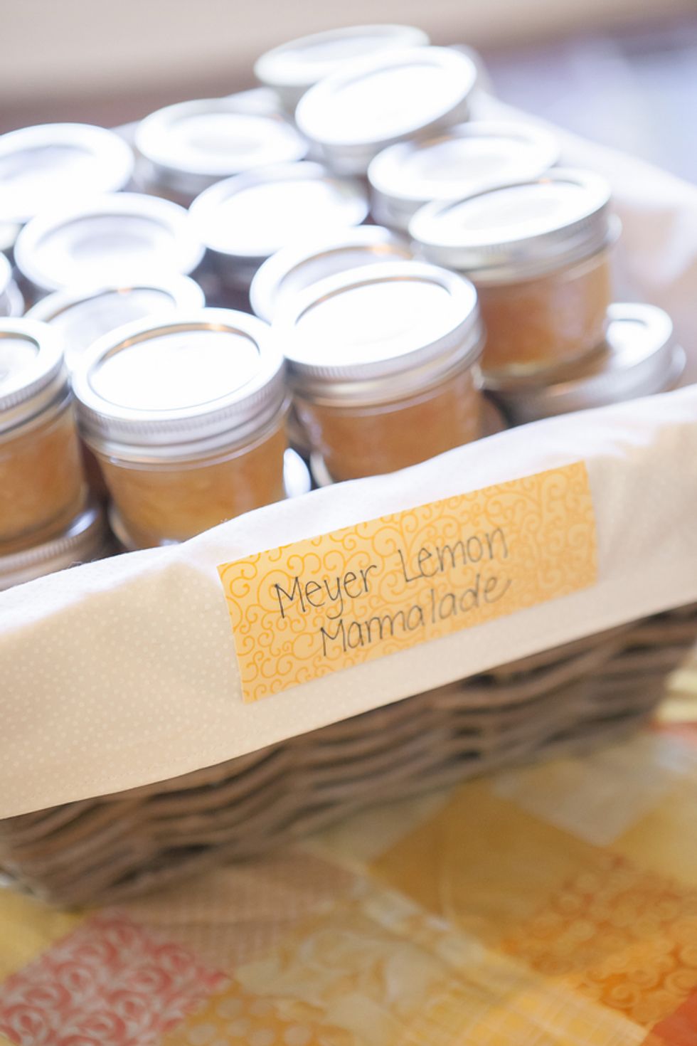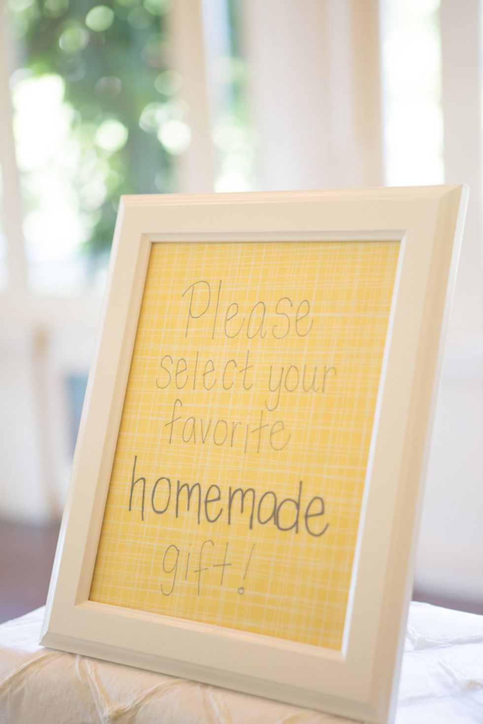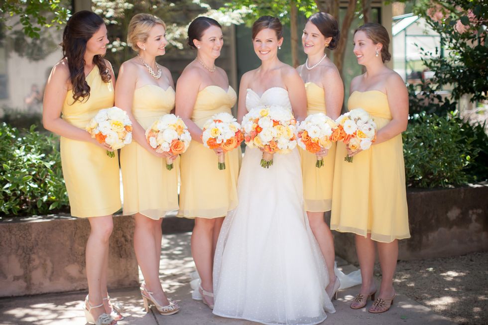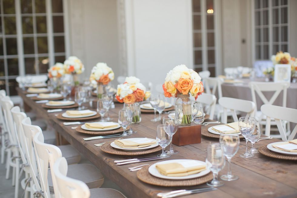 A bright yellow poppy bouquet (in a mason jar, of course) was the motif used on the invitations, menus, and other printed goods. The bride's mom even hand-sewed Cait and Timm a wedding quilt in their wedding colors: bright yellows and oranges. The scraps left over were used for escort cards and favors. On the back of each card was a handrwritten personal note to the guest from the bride and groom.