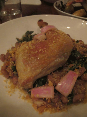 This week's menu was a standout: chicken leg confit, Dungeness crab to share, and lentils with brussels sprouts, romanesco, leeks, and a runny egg. The quick-fried baby artichokes with hollandaise were crunchy and delicate. The chunky fingerling potatoes with slivers of tart apple, bacon, chicory, and ricotta warmed me over. Dessert was an apple bread pudding with caramel sauce that was fluffy and surprisingly light.