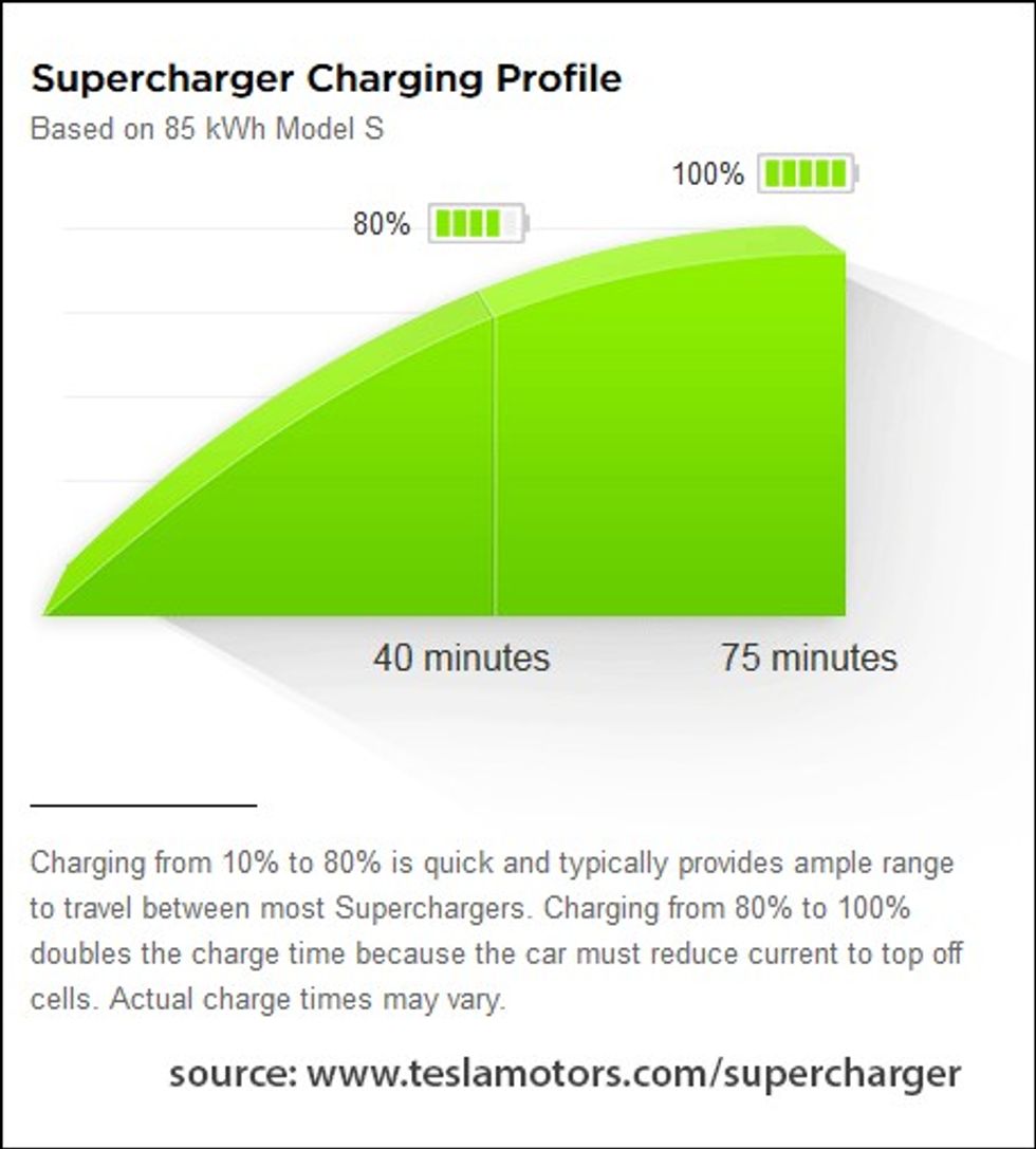 Tesla, unsurprisingly, bounds over the competition with 480-volt superchargers that get the job done superfast, capable of charging the car's battery from near-zero to full in about an hour. Need a quickie? Plug in for just 20 minutes for about 170 miles of range. It's quite a feat of engineering, especially when you consider that even the best, most efficient home-installed 240-volt charger would struggle to fully power a battery in less than three hours. Tesla superchargers are also free to use.