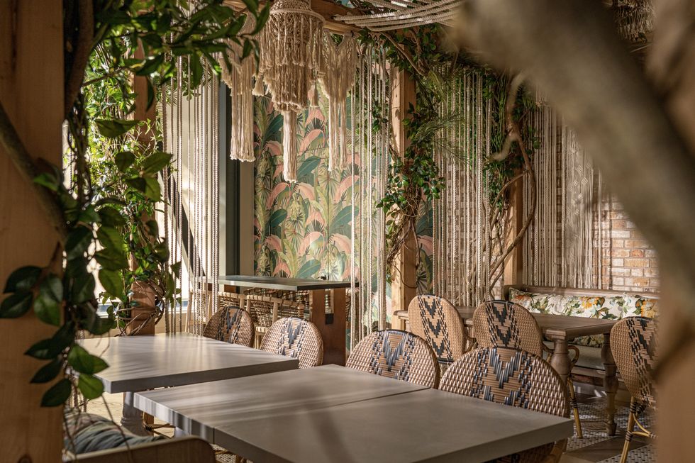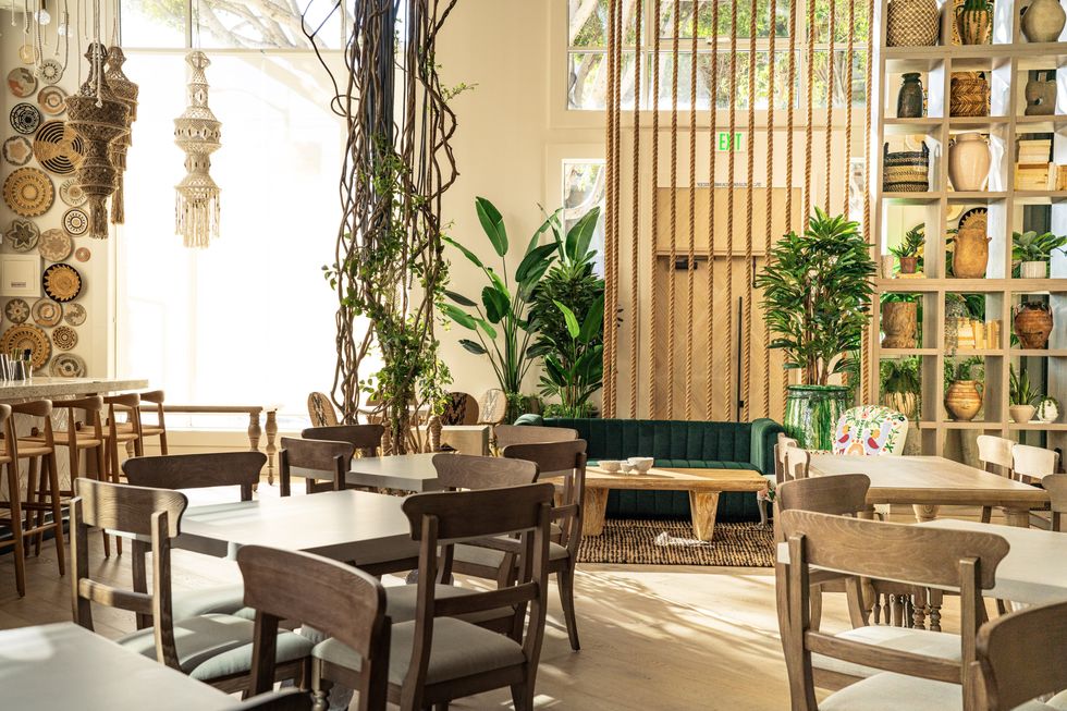 One side of the restaurant is intimate and enclosed with curtains of rope. Overhead, intricate macrame light fixtures and woven, upside-down baskets hang like fruit from the trees. The other side, the one dominated by the bar, with high ceilings and a wall of ceramic jugs and jars, is airy and atmospheric. Combined, the effect is completely enchanting.